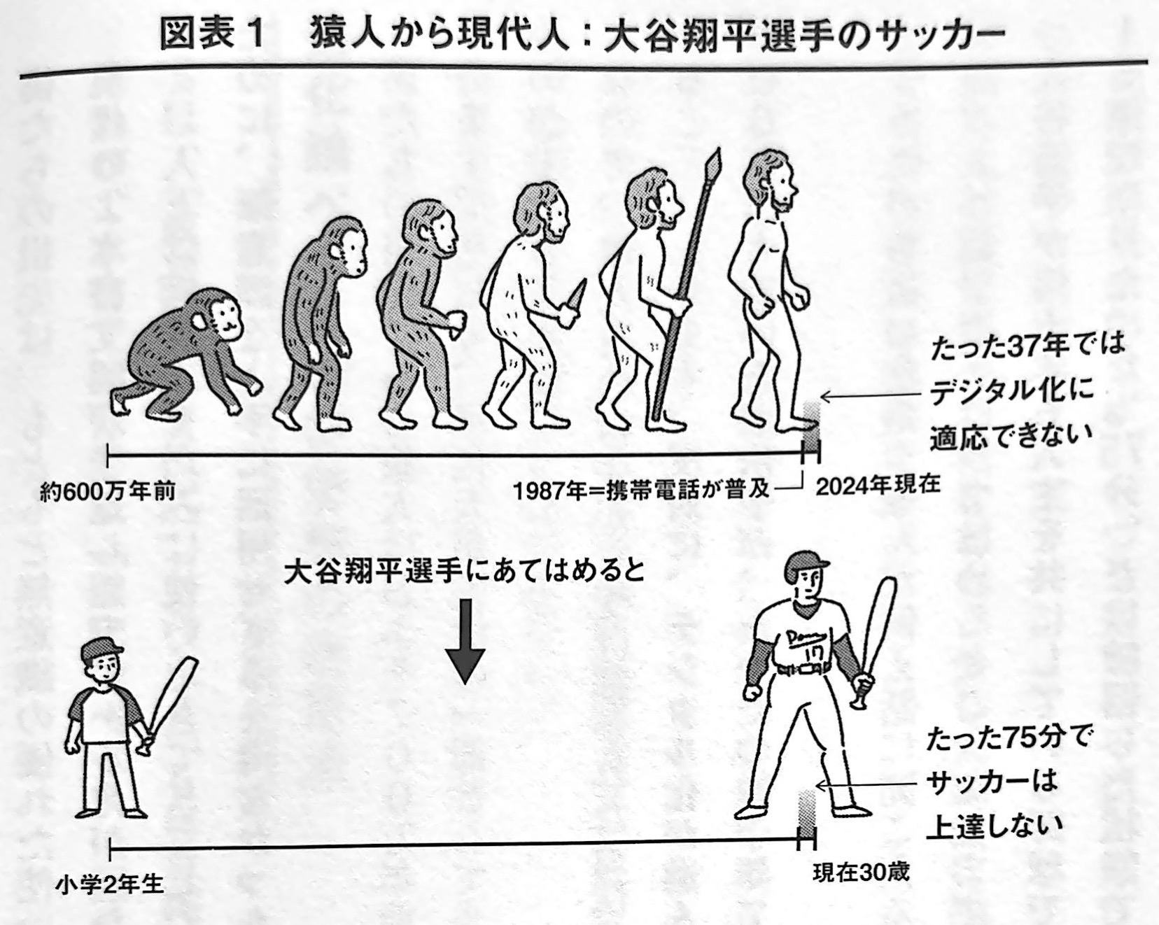 なので、僕たちの祖先から受け継がれた遺伝子は、少なくとも600万年間続いていることになります。反対に、デジタル化が進んでからの現代文明はたったの数十年。600万年も続いた遺伝子が、たったの数十年で適応できるわけがありません。つまり、ちょっとぶっ飛んだ例え話に聞こえるかもしれませんが、この進化論の時間軸を、大谷翔平選手に当てはめるとこうなります。