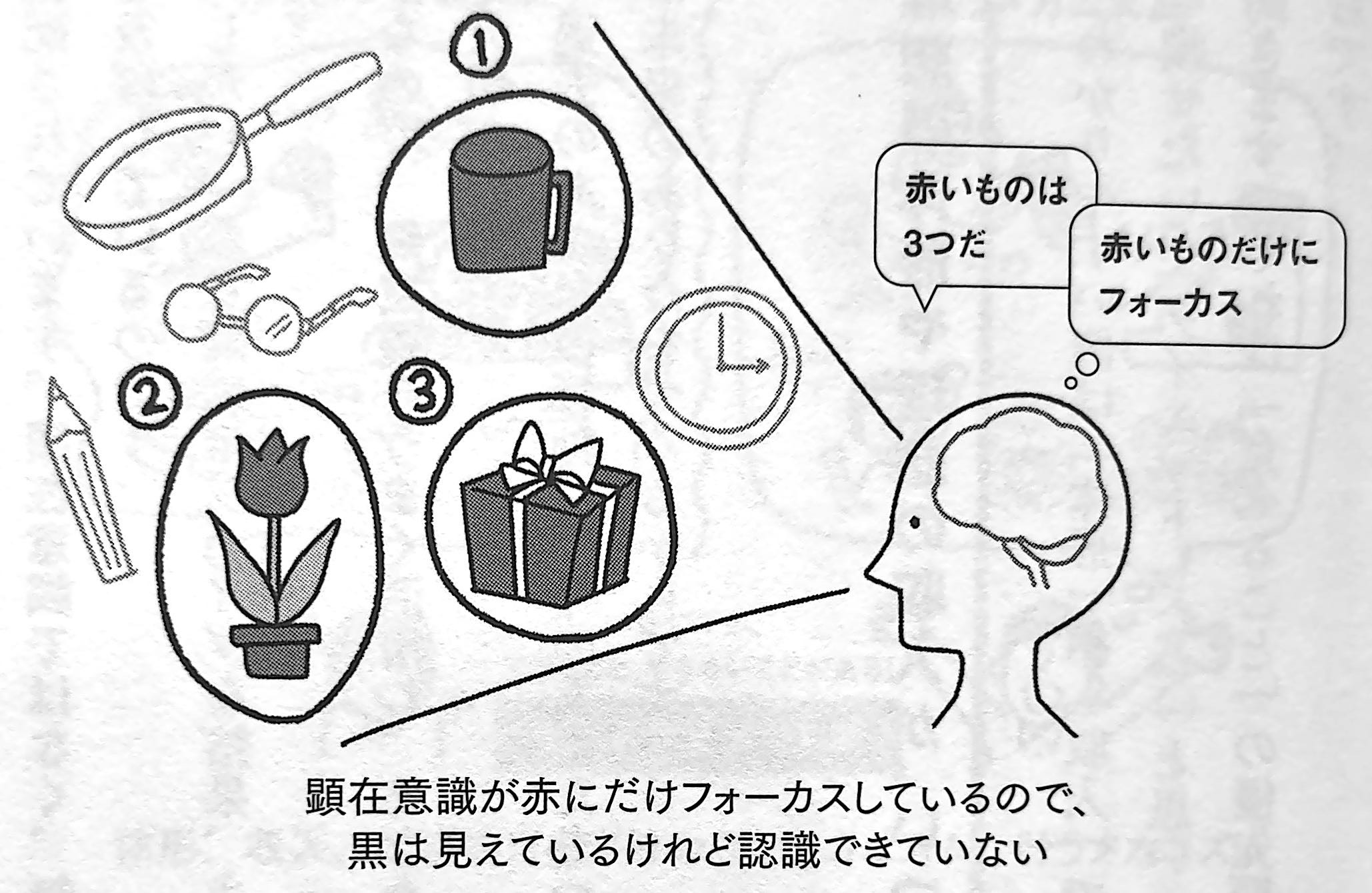 ①10秒間、あなたの周りに「赤いもの」がいくつあるか数えてみてください(10秒経ったら探すのをやめて、本書に視線を戻してください)②10秒経ちましたね。もう周りは見ないでください。