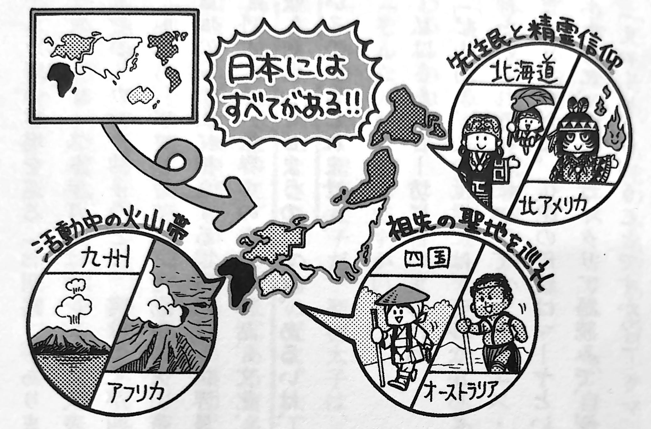 実は世界の大陸をすべてつなげると、日本列島の形になるのですな。北海道は北アメリカに、ヨーロッパは本州に、オーストラリアは四国に、アフリカは九州になるのです。そして、それぞれの土地の文化や歴史、気質、特産品から鉱山資源にいたるまで、リンクしているのですよ。