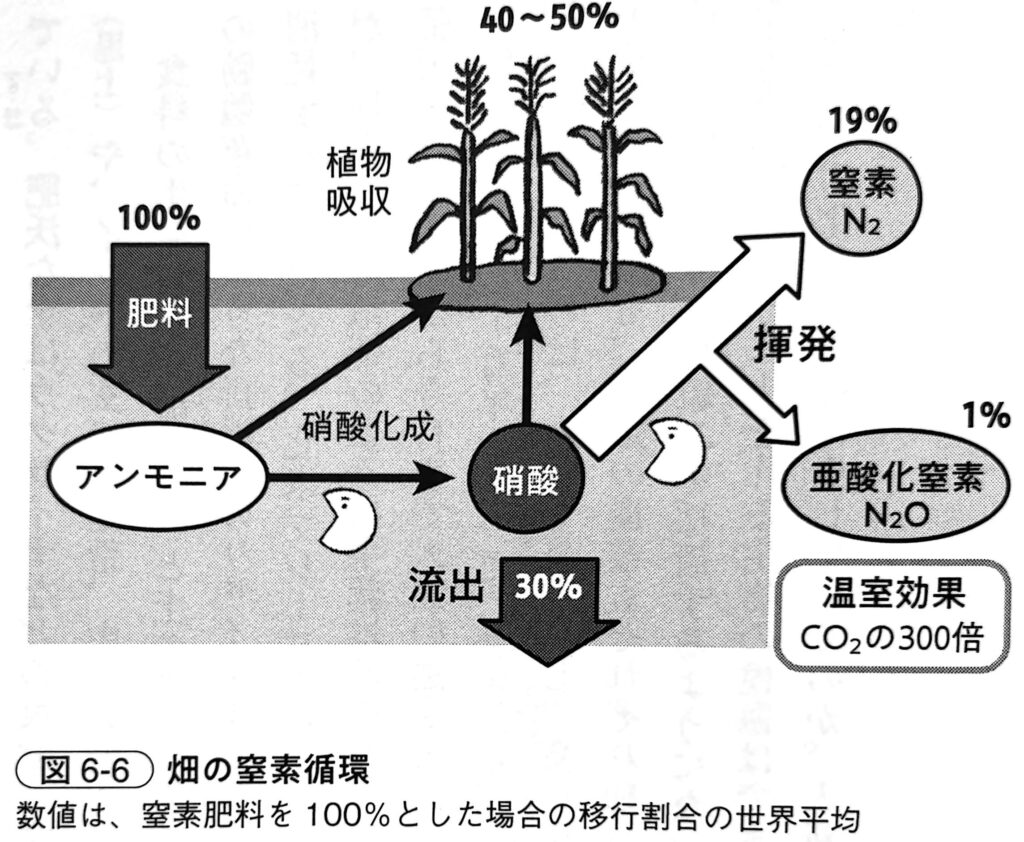 もったいない話だが、余った窒素肥料が細菌(脱窒菌)の働きで大気へと還(かえ)るならば問題ない。ところが、脱窒菌は十分な炭素源を必要とする。植物や土の炭素が窒素に対して不足すると、窒素循環が完結しない。余ったアンモニアは微生物によって硝酸に変化することで畑の土を酸性に変える。さらに雨で流されると、地下水の汚染や湖の富栄養化を引き起こす。ともにマイナス電気を帯びる硝酸イオンと粘土は反発しあい、吸着しにくいためだ。窒素の一部(肥料の約1%)は、二酸化炭素の300倍の温室効果を持つ亜酸化窒素(N2O)として地球温暖化を加速してしまう(図6−6、下図を参照)。