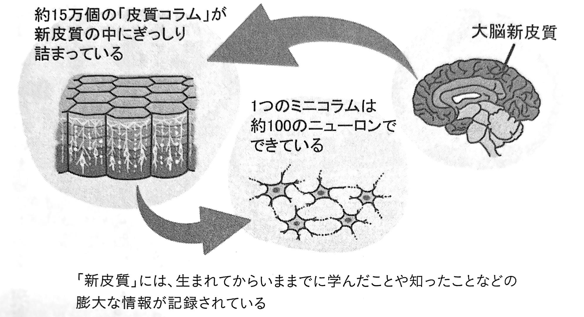 脳には「古い脳」の上に、知能を司る「新しい脳」、つまり新皮質が加わっています。この新皮質の中に、「約15万個の「皮質コラム」があり、さらにその中には数百の「ミニコラム」があります。
