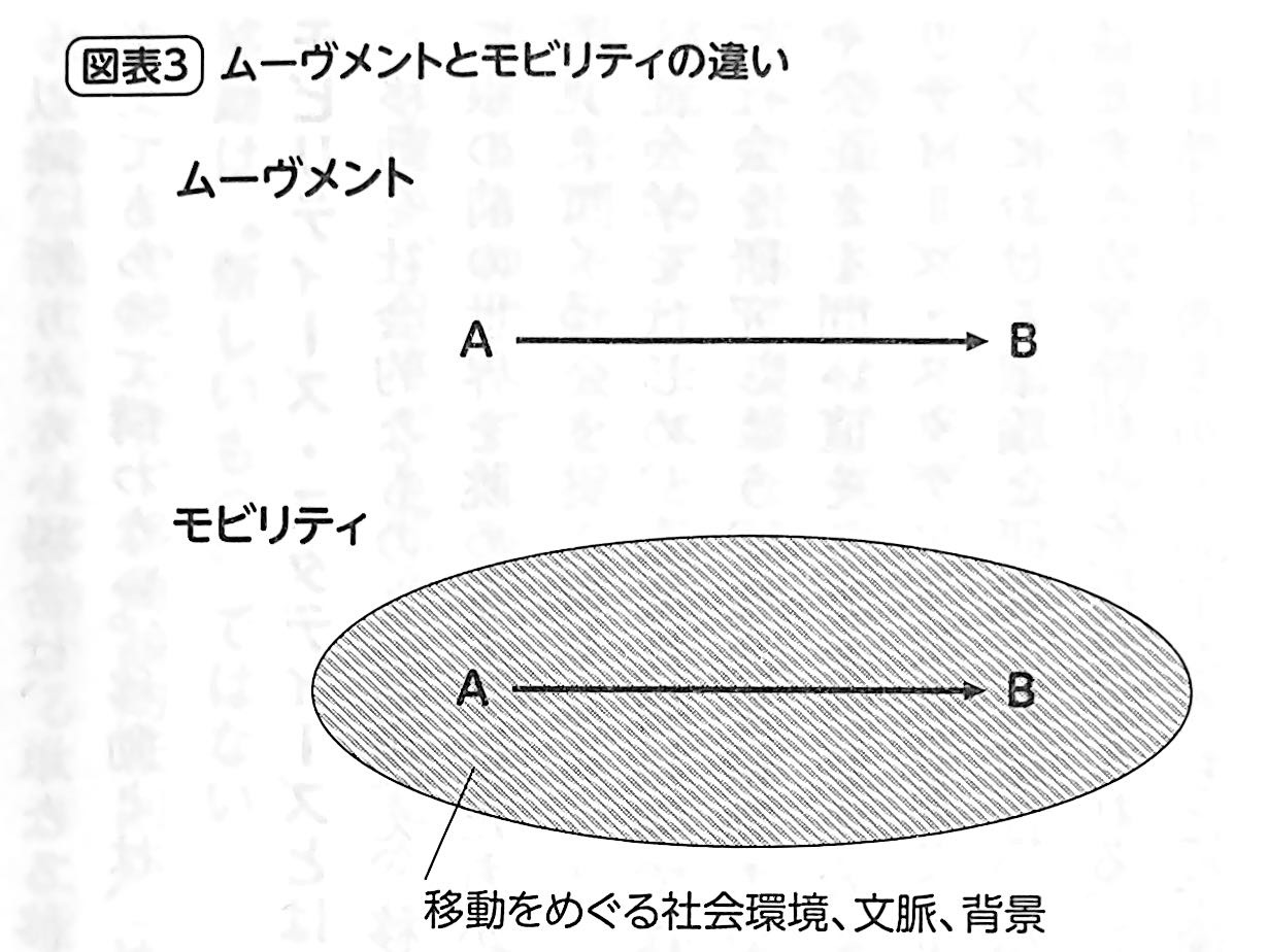 このようにA→Bというムーヴメントを社会構造や文脈の中に位置づけて捉え、それらと切り分けて移動は存在し得ないと考えた場合の「A→B」という移動を、本書は「モビリティ(移動/移動性)」と呼ぶこととしたい。A→Bというムーヴメントを囲む環境や構造、文脈、背景をセットで考えた際の移動が、モビリティというわけである(図表3下、下図参照)。