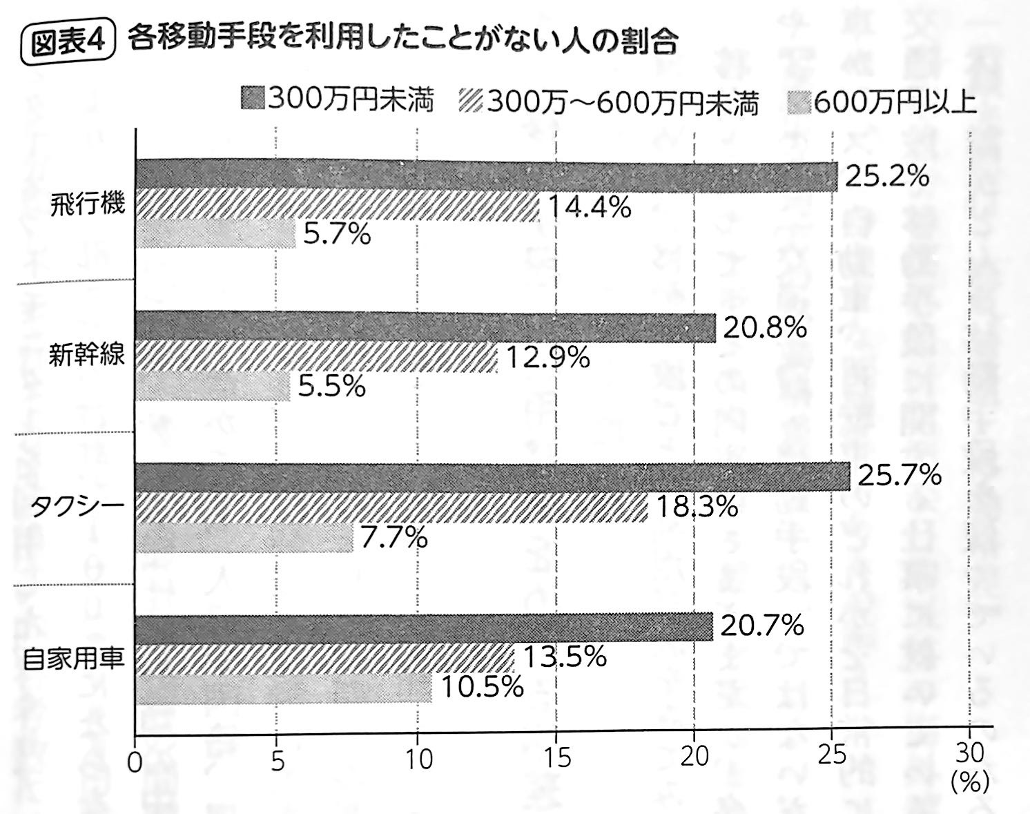 図表4(下図参照)は、自家用車、タクシー、新幹線、飛行機を「利用したことがない」人の割合を示したものである。日々、これらを使って移動するのが当たり前の人は、驚くかもしれないが、移動手段の利用をめぐっては明確に格差が存在する。それは、4つの移動手段すべてにおいて、年収が低いほど利用したことがない人の割合が高いという事実である。