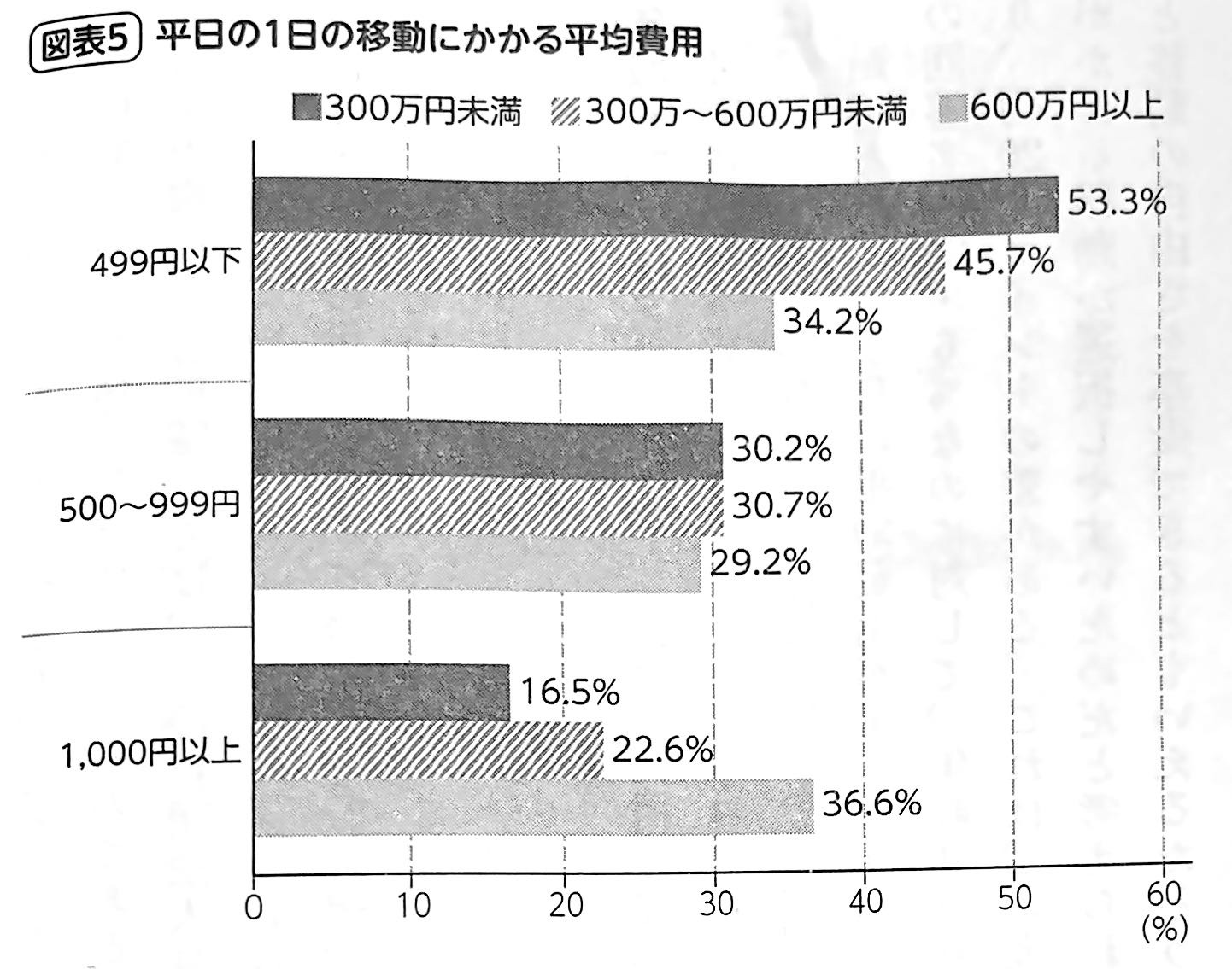 自家用車の保有に関しては、一般社団法人日本自動車工業会が保有世帯のより詳しい調査結果を示している(2024年)。それによれば、年収を5つの層に分けた場合、低所得層では56.7%の世帯しか車を保有しておらず、ほぼ半分の世帯は自家用車社会の恩恵を十分に受けられていない。平等な移動を実現していくためには、この階層により幅広く移動サービスを提供していくことが求められるのである。移動にかかる費用もみてみよう。平日1日の移動にかかる平均費用を示した図表5(下図参照)からは、年収が低い回答者ほど、移動にかかる平均費用が少ない人が多い傾向が読み取れる。
