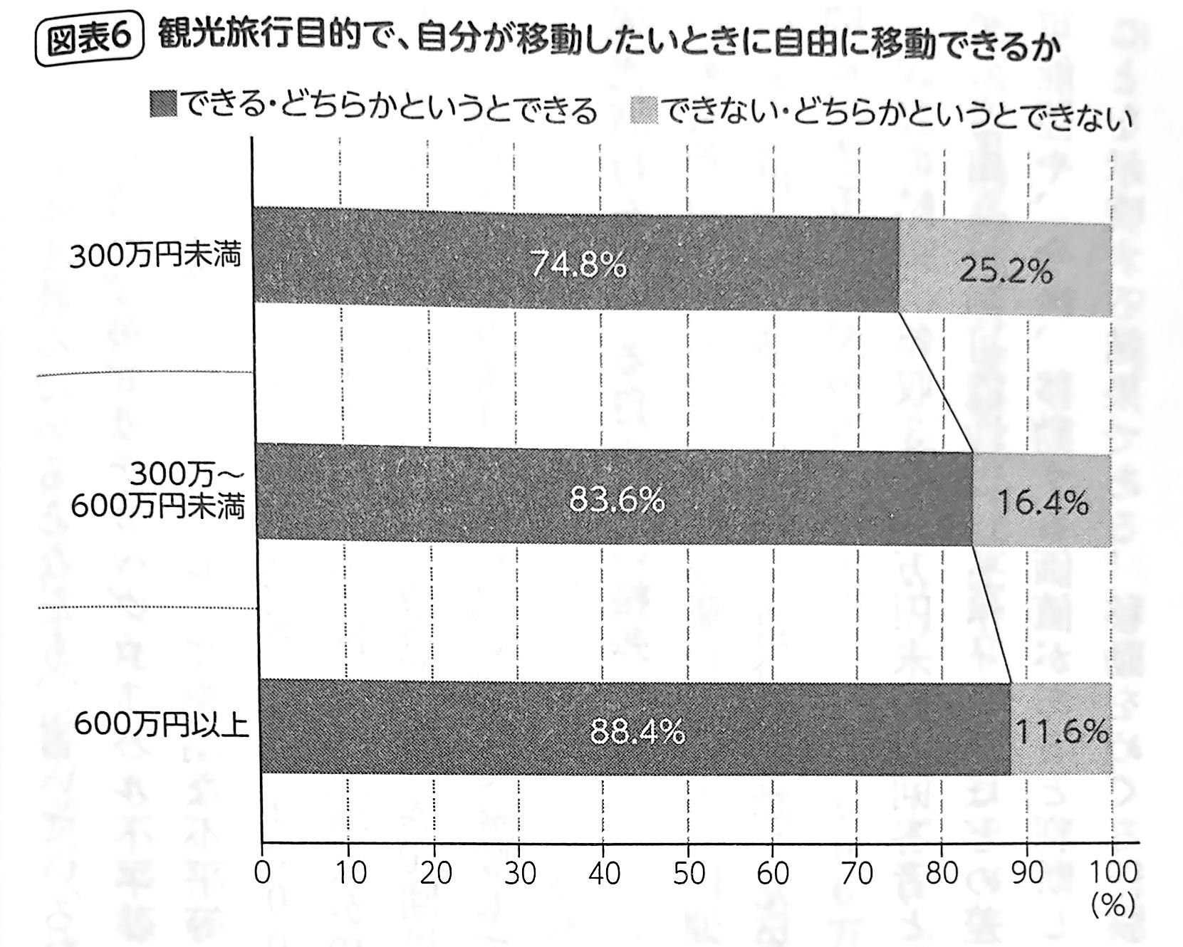 この分野においては、公益社団法人チャンス・フォー・チルドレンが、子どもの体験格差をテーマに類似の調査を行っている。それによれば、観光旅行は、数ある文化的体験の中で、世帯年収の多寡で生じる“体験格差”が最も大きい。旅費交通費てどの支出が避けられず、保護者の時間的余裕も必要なことが理由である。本書調査は、主に大人の移動経験と移動格差を調査対象とする点が、チャンス・フォー・チルドレンとの違いである。