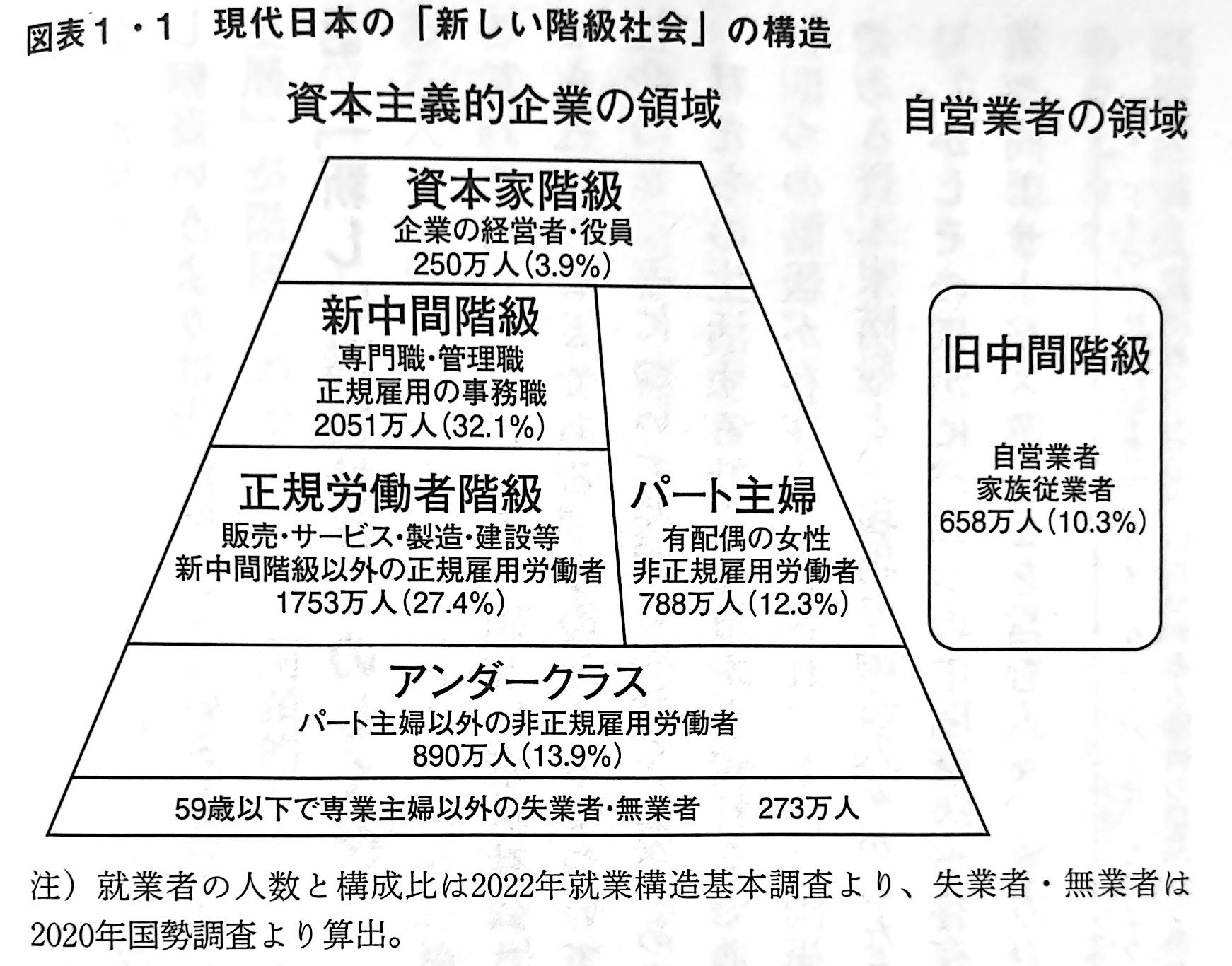 資本主義的企業の領域には、四つの階級が存在する。人数の少ない資本家階級を頂点に、上下に積み重なるしくみになっているので、ピラミッド型に近い台形で表現しておいた。いちばん上に位置するのは、経営者・役員からなる資本家階級である。2022年の統計から推計すると、その人数は250万人で、就業人口の3.9%を占めている。