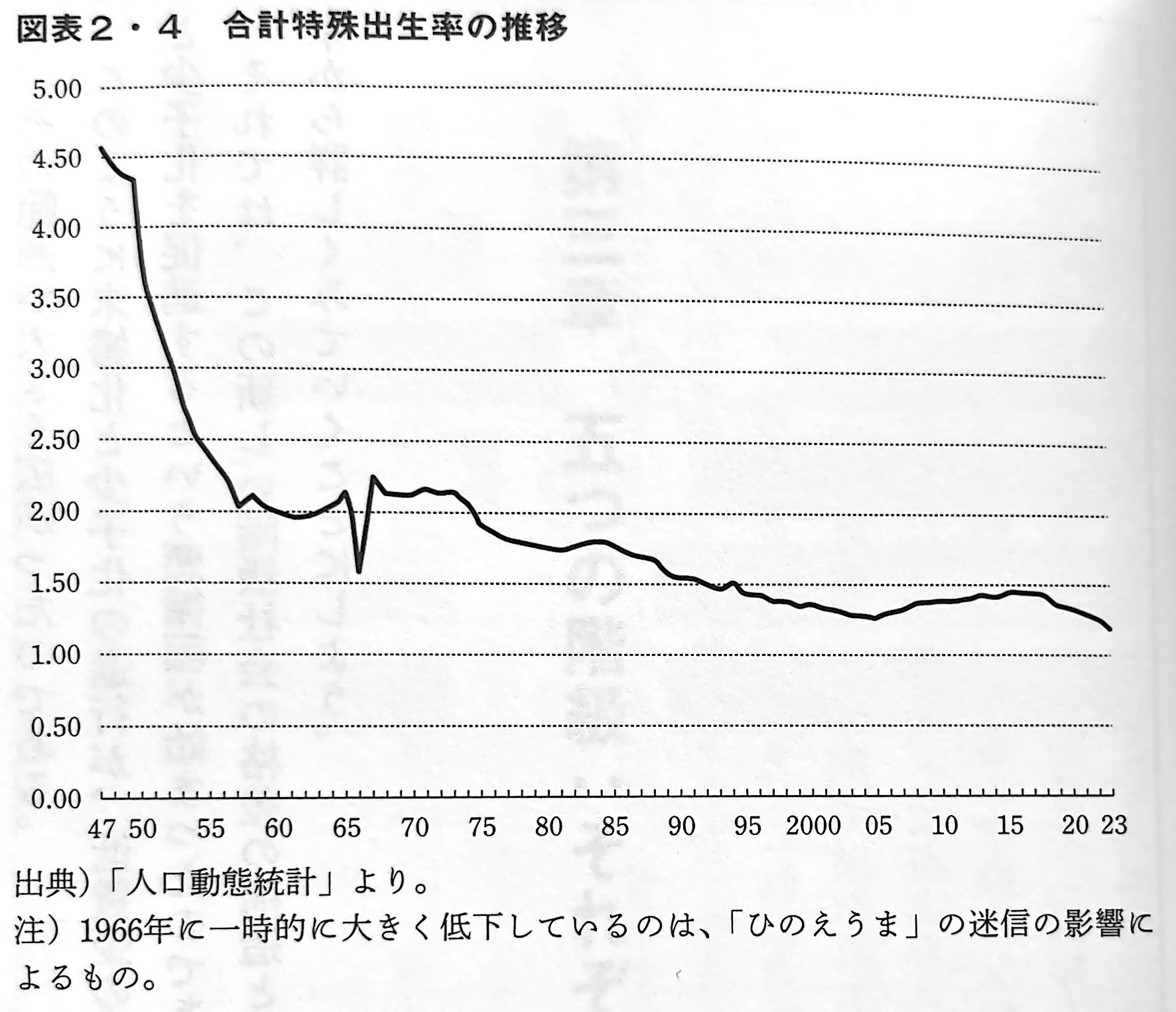 先に私は、アンダークラスの労働力の価値は、次世代を再生産する費用を含まない形で再定義されていると書いた。なぜ、このようなことが可能になったのか。それはおそらく、循環論法にみえるかもしれないが、少子化が進んだからである。日本の合計特殊出生率(一人の女性が生涯のうちに生む子供の数)は、1950年には3.65だったが、その後は急速に低下し、1960年には2.00にとなったものの、高度経済成長期はほぼ2前後を維持していた。しかしその後は低下傾向を見せるようになり、1990年には1.54、2000年には1.36、2005年に1.26となった。その後はやや持ち直し、2015年には1.45まで回復したが、以後は再び低下に転じ、2023年には1.20となった(図表2・4)(下図を参照)。