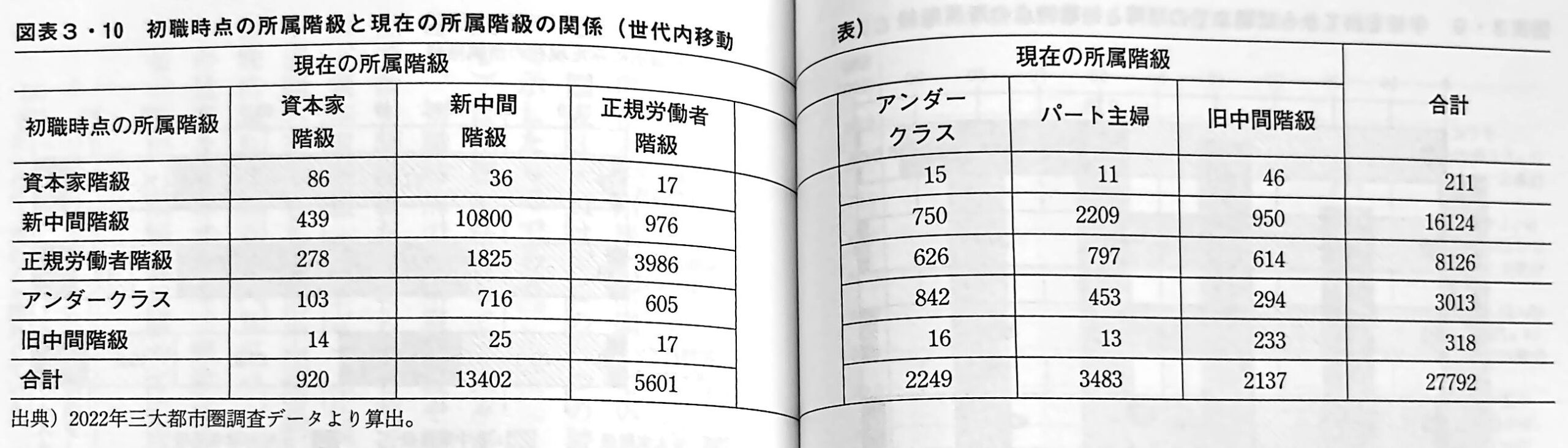 まず、数表の上から二行目、初職が新中間階級の行に注目しよう。横方向の合計欄は1万6124人となっている。これが、初職時点で新中間階級だった人の数である。これらの人々が現職では、新中間階級にとどまったり、他の階級に移動したりしている。その人数はというと、新中間階級にとどまった人が1万800人、資本家階級に移動した人が439人、正規労働者階級に移動した人が976人、アンダークラスに移動した人が750人、旧中間階級に移動した人が950人である。このような集計表は、人々が初職時点と現職時点の間で、階級と階級の間をどの程度まで移動したかを示す表なので、一般的に世代内移動表と呼ばれている。