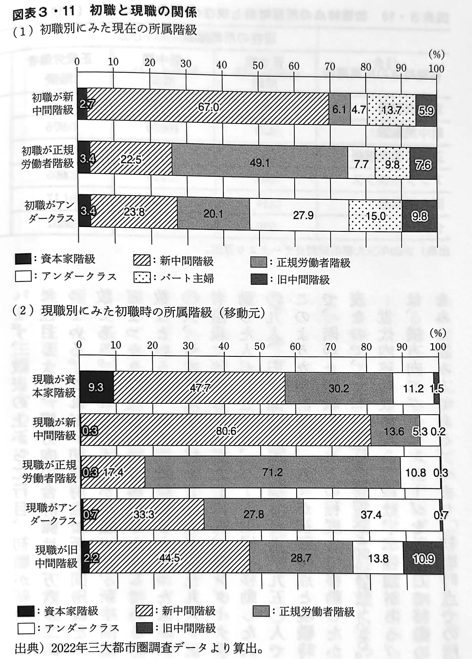 世代内移動表の読み方には、二種類がある。ひとつは、横方向にパーセンテージを計算して移動のようすをみる読み方である。つまり、初職時点での所属階級に注目し、初職時点である階級に所属していた人が、現職ではどのように分布しているかをみるものである。もうひとつは、逆に現職に注目して縦方向にパーセンテージを計算し、現在ある階級に所属している人々が、どの階級からやって来たのかをみる読み方である。図表3・11(下図を参照)は、この二つの読み方で世代内移動表をみるため、パーセンテージをグラフで示したものである。