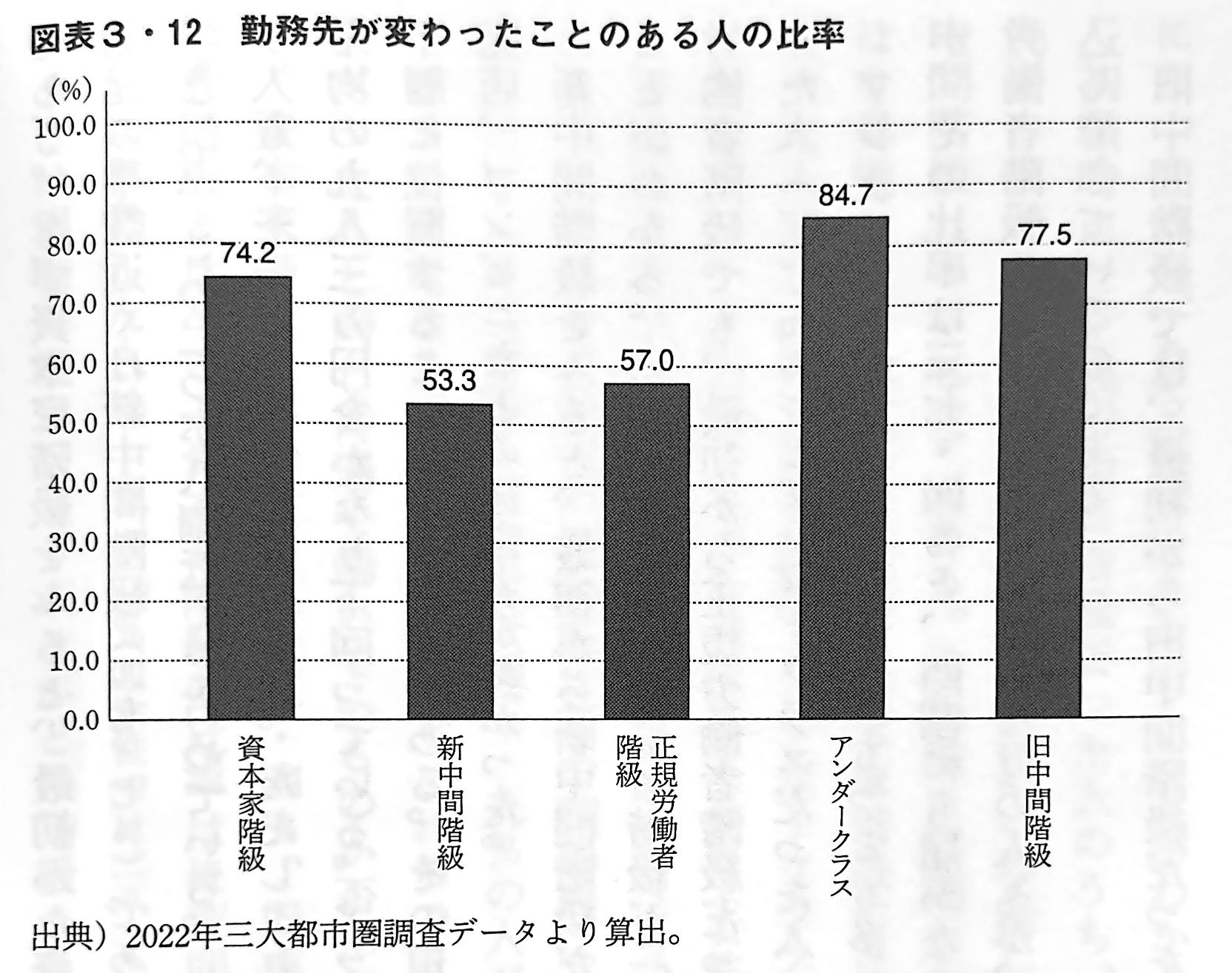 次に、転職経験についてみてみよう。調査結果によると、現職のある人のうち6割を超える63.1%の人が、これまでに勤務先を変わったことがあると答えている。これを所属階級別にみたのが図表3・12(下図を参照)である。階級によってかなりの差があり、新中間階級(53.3%)と正規労働者階級(57.0%)では勤務先を変わったことのある人が5割台にとどまるのに対して、資本家階級(74.2%)と旧中間階級(77.5%)は7割台で、もっとも多いのはアンダークラス(84.7%)である。