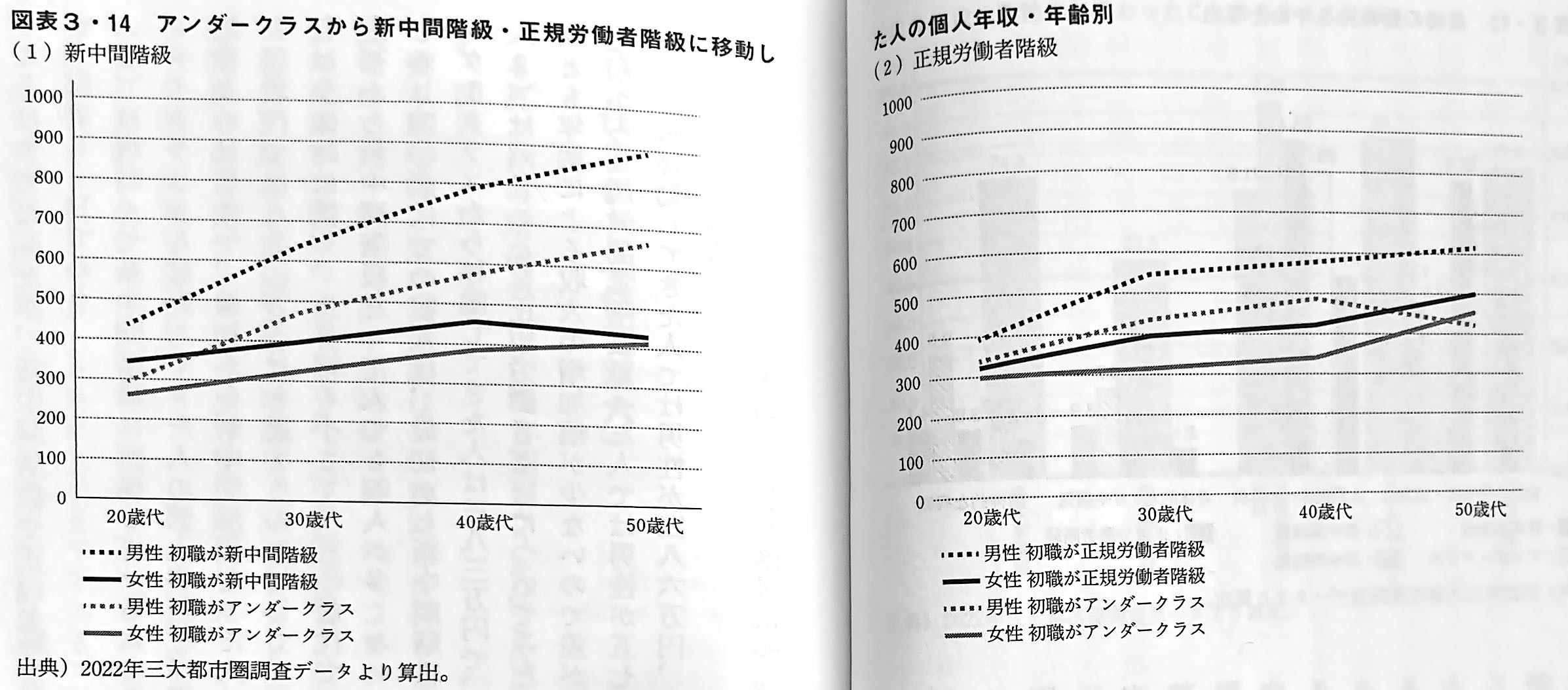 (2)は同じことを正規労働者階級についてみたものである。新中間階級に比べると、男女とも年齢による収入の増加幅が少ないので差が目立たないが、40歳時点での年収は、最初から正規労働者階級だった人では男性が578万円、女性が422万円、アンダークラスから移動してきた人では486万円、女性が340万円で、いずれも100万円近くの差がある。