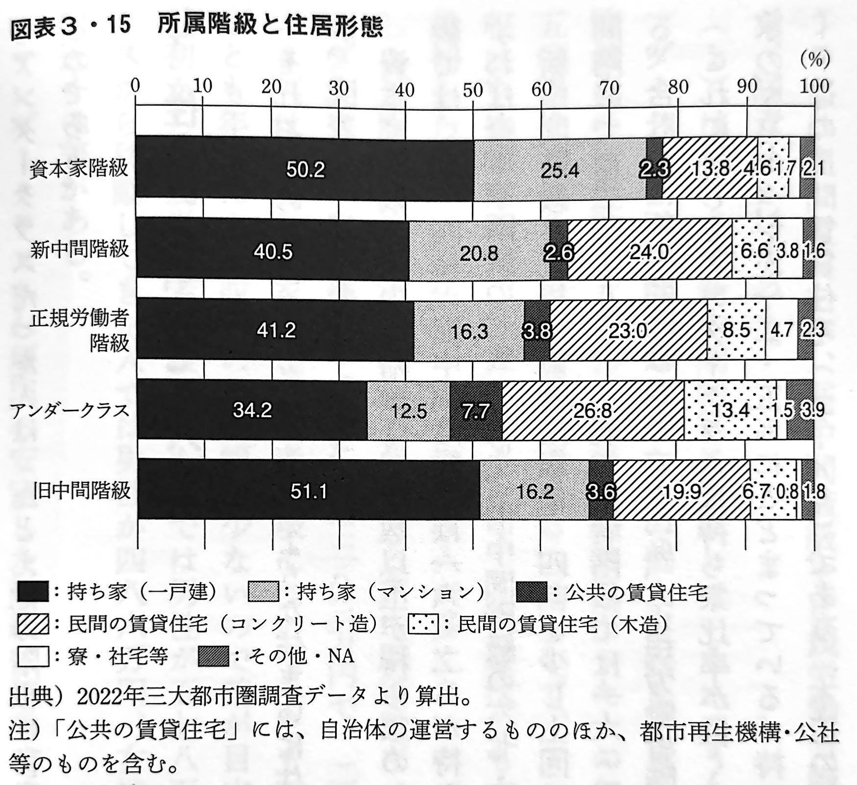 (1)は近所の人とのつきあいがないと答えた人の比率である。設問には四つの選択肢があり、「つきあいがない」の次につきあいが少ないのは「あいさつする程度の人がいる」となっている。つまり、出会い頭にあいさつをする人すらいないという比率である。回答からみると、6つのグループは大きく三つに分かれる。つきあいのない人が少ない資本家階級と旧中間階級、中間的な新中間階級と正規労働者階級、そしてつきあいのない人が多いアンダークラスと失業者・無業者である。アンダークラスと失業者・無業者の4割以上には、あいさつする人すらいない。図表3・15(下図を参照)でみたように、アンダークラスには共同住宅に住む人が多いから、階段や廊下などで出会う人はいるはずだが、それでもあいさつすらしないのである。