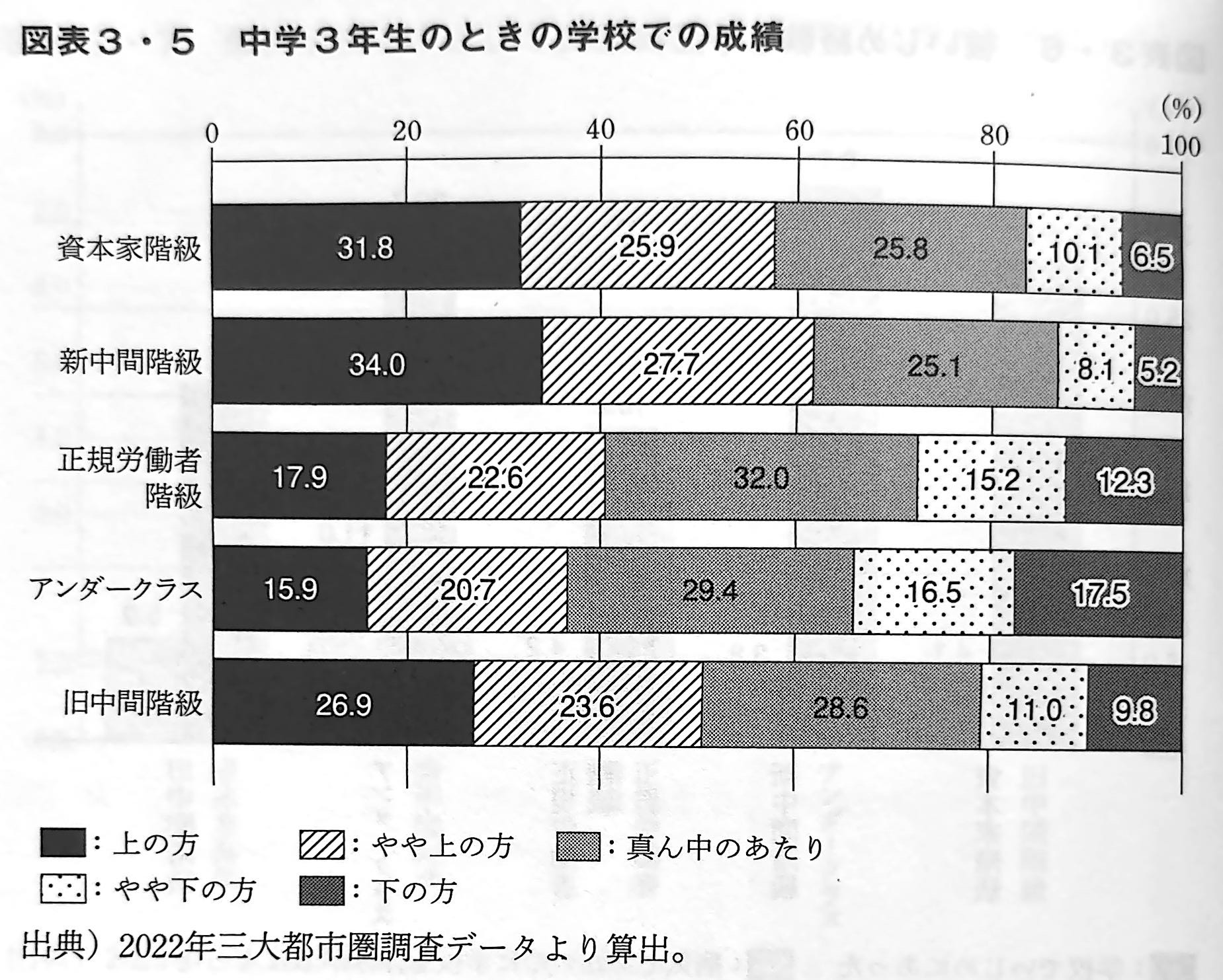 進学やその後のキャリアなど、進路に関する研究では、中学3年生のときの学校での成績が注目されることが多い。高校に進学するか否か、進学先は普通科なのか職業科なのか、また進学校かそうでないかを決定するが、中学3年生のときの成績だからです。図表3・5(下図を参照)は、これを現在の所属階級別にみたものである。