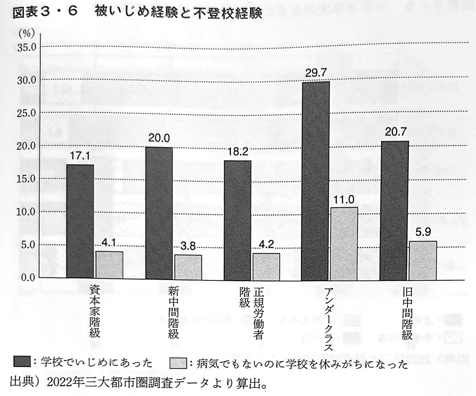 図表3・6(下図を参照)は、中学校を卒業するまでに、学校でいじめにあったことがあるか、病気でもないのに学校を休みがちになったことがある(つまり不登校になったことがある)かについて尋ねた結果を、所属階級別にみたものである。これは、ややショッキングな結果である。いずれの比率も、アンダークラスが飛び抜けて高い。いじめを経験した人の比率は29.7%に達しており、他の階級を10%前後、あるいはそれ以上も上回っている。またアンダークラスで不登校を経験した人は11.0%に達しており、他の階級の1.8倍から2.9倍に達している。