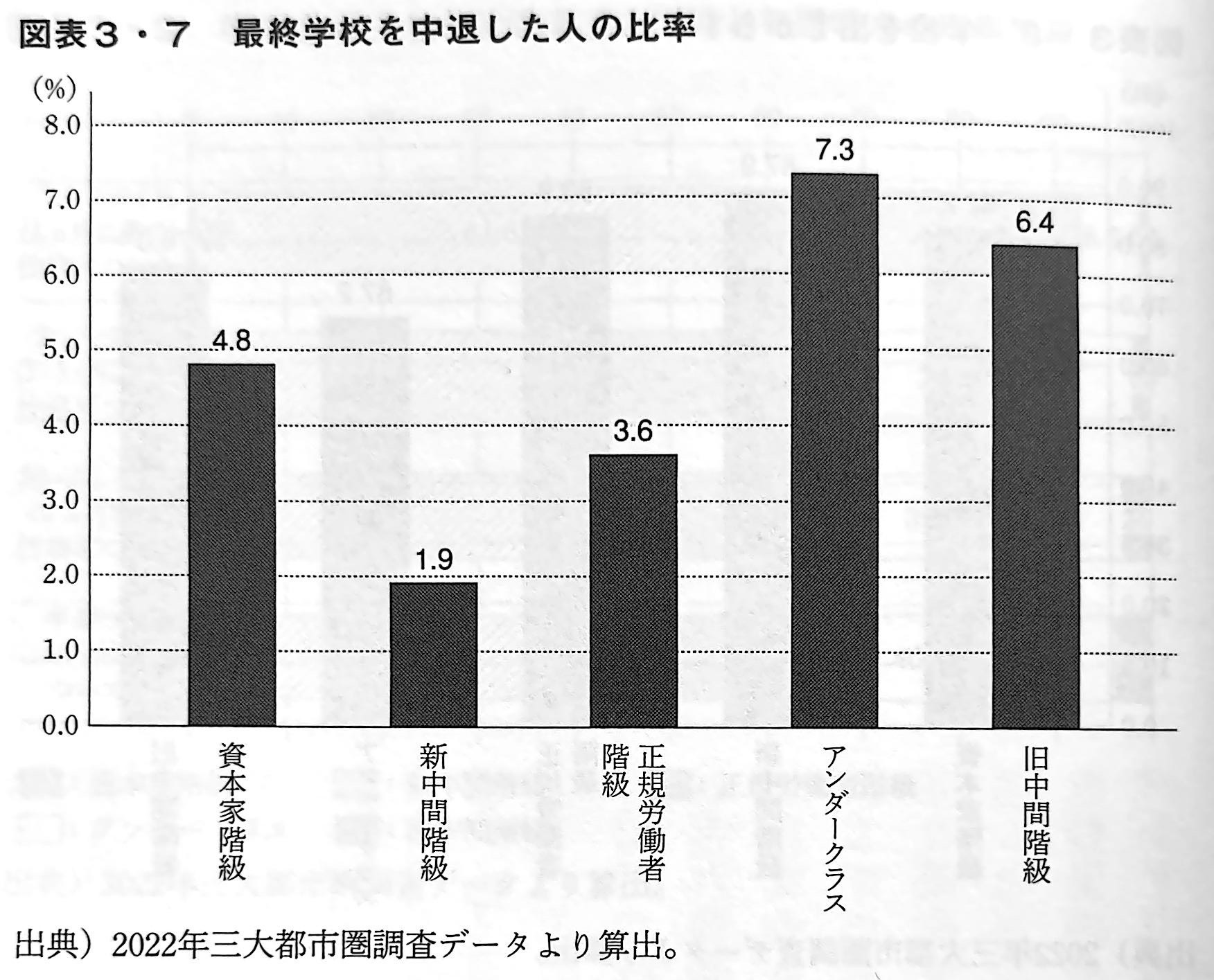 図表3・7(下図を参照)は、最終学校を中退した人の比率を示したものである。アンダークラスでは中退者が7.3%に上っている。これは新中間階級(1.9%)の3.8倍、正規労働者階級(3.6%)の2倍にあたる。アンダークラスには、いじめや不登校などを経験しながら、最終的に学校教育から排除された経験をもつ人がかなりいるということがわかる。