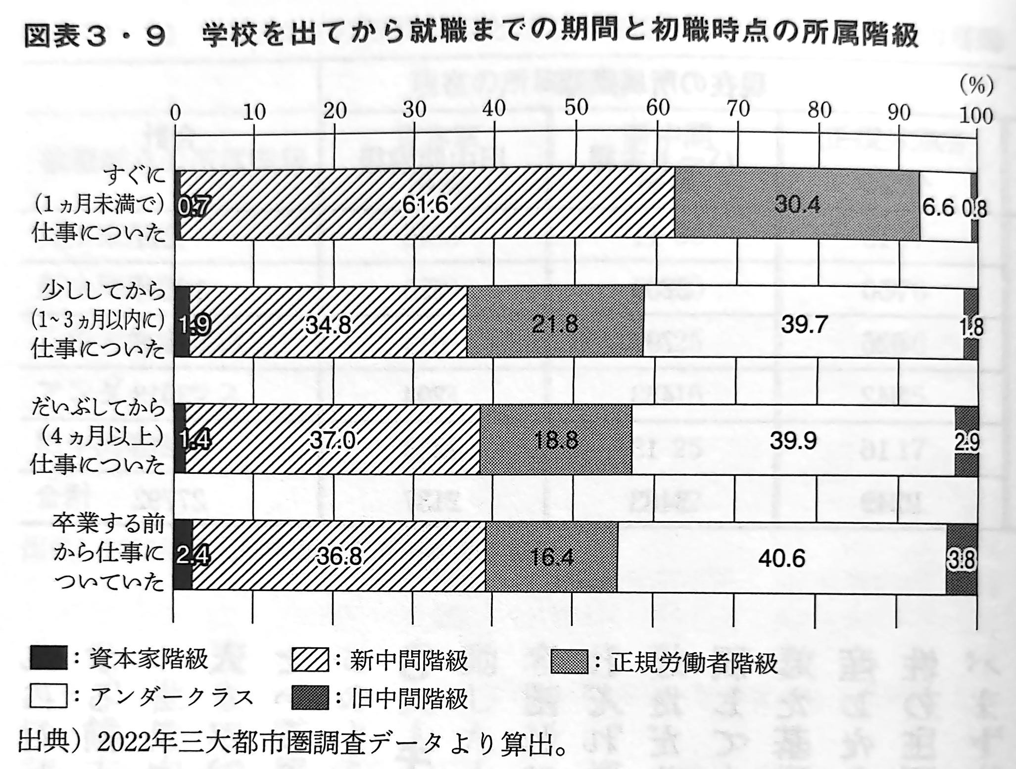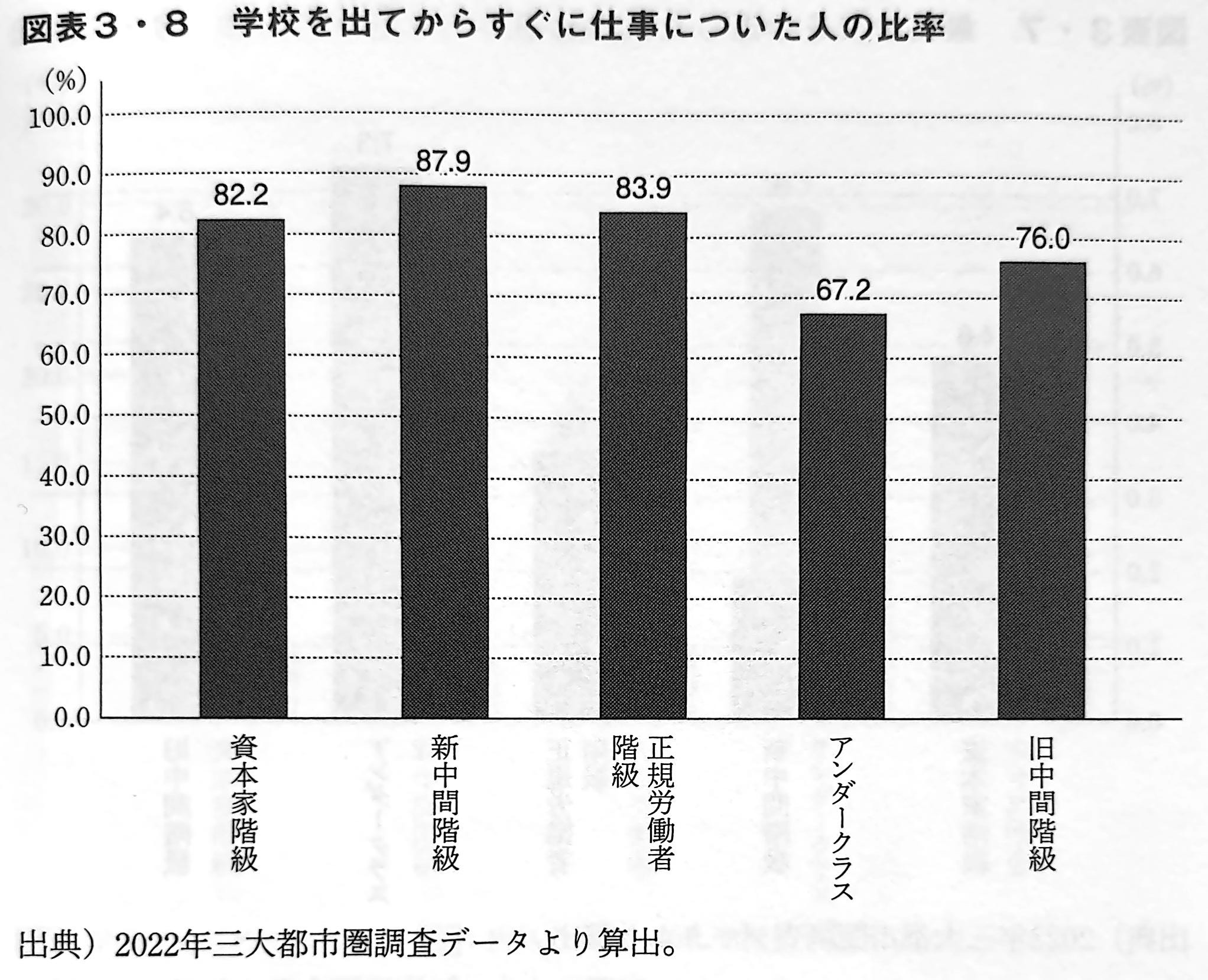 図表3・8(下図を参照)は、卒業(または中退)してすぐに仕事についた人の比率を示したものである。調査では卒業から1ヵ月未満で仕事についた場合を「すぐに仕事についた」として扱っている。アンダークラスはこの比率が他の階級に比べてかなり低く、67.2%に過ぎない。残りの32.8%の内訳は、「少ししてから(1〜3ヵ月以内)」が10.9%、「だいぶしてから(4ヵ月以上)が13.3%と多く、「卒業する前から仕事についていた」という、アルバイトがそのまま初職になったと思われるケースが8.6%となっている。