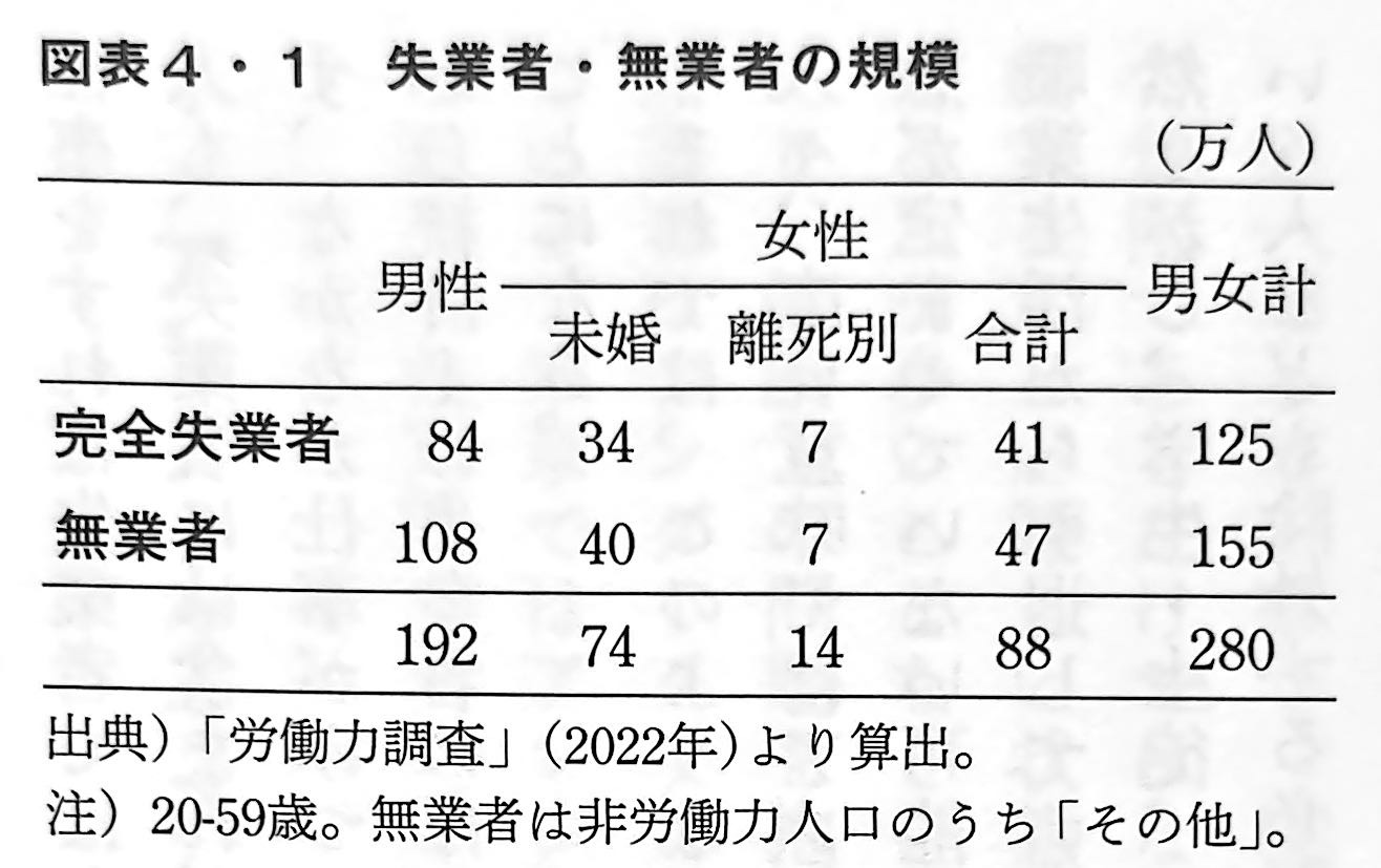 図表1・1のいちばん下には、59歳以下で専業主婦以外の失業者・無業者を位置づけておいた。専業主婦でも学生・生徒でもなく、また職業をもっていておかしくない年齢であるにもかかわらず、失業している。あるいは何かの事情で職業についていない人々である。その人数は273万人に上がっている。これらの人々はアンダークラスとの共通点が多く、断続的に職業についていたり、職業を離れてかなりの時間が経つなどした人々を多く含んでいる。これらの人々については、アンダークラスについて詳しく検討する第四章で、いっしょに検討することにしたい。『新しい階級社会』 第一章 より 橋本健二:著 講談社:刊