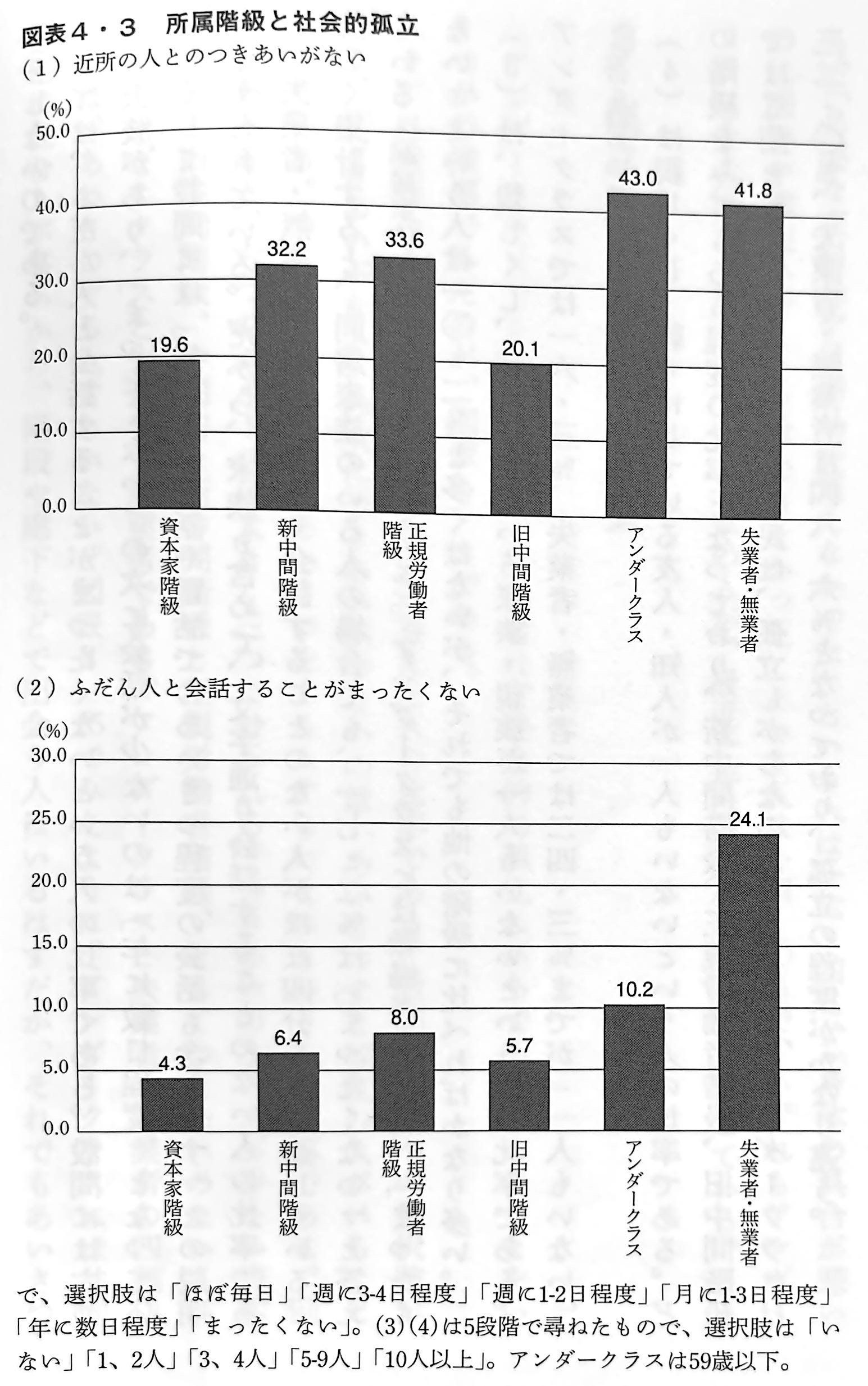 (2)は、ふだん人と会話することがまったくないという人の比率である。設問には6つの選択肢があり、「まったくない」の次に会話が少ないのは「年に数日程度」となっている。そして設問には「家族との会話や電話でのあいさつ程度の会話も含みます」との説明が添えられている。だから、家族も含めて、文字通り会話することのない人の比率である。失業者・無業者では、まったく会話することのない人がほぼ4分の1に達している。詳しく集計すると、同居家族のいる人の場合でも、17.2%は「まったくない」と答えている(同居家族がいない場合37.6%)。アンダークラスには職場があるから、「まったくない」という人は10.2%と多くはないが、それでも他の階級に比べればかなり多い。