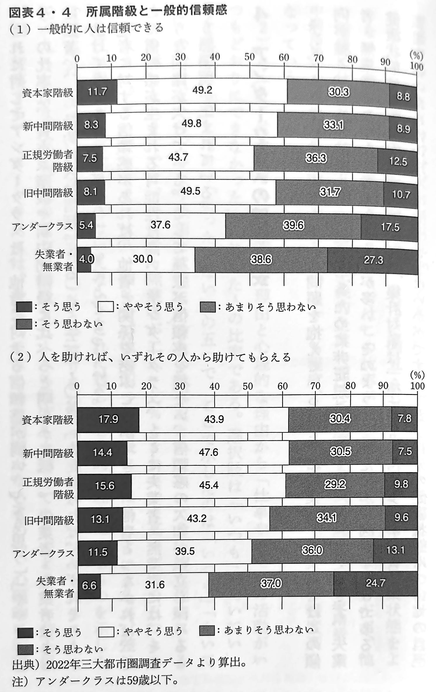 これに対してアンダークラスは、他者に対する信頼感が弱い。「そう思う」「ややそう思う」の比率は、資本家階級や新中間階級に比べると明らかに低い。失業者・無業者はさらに顕著で、「一般的に人は信頼できる」では34.0%、「人を助ければ、いずれその人から助けてもらえる」では38.2%にとどまっている。