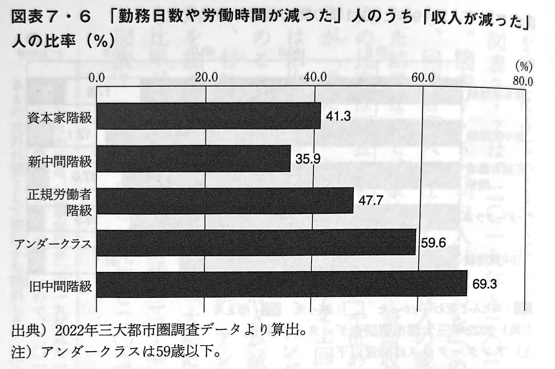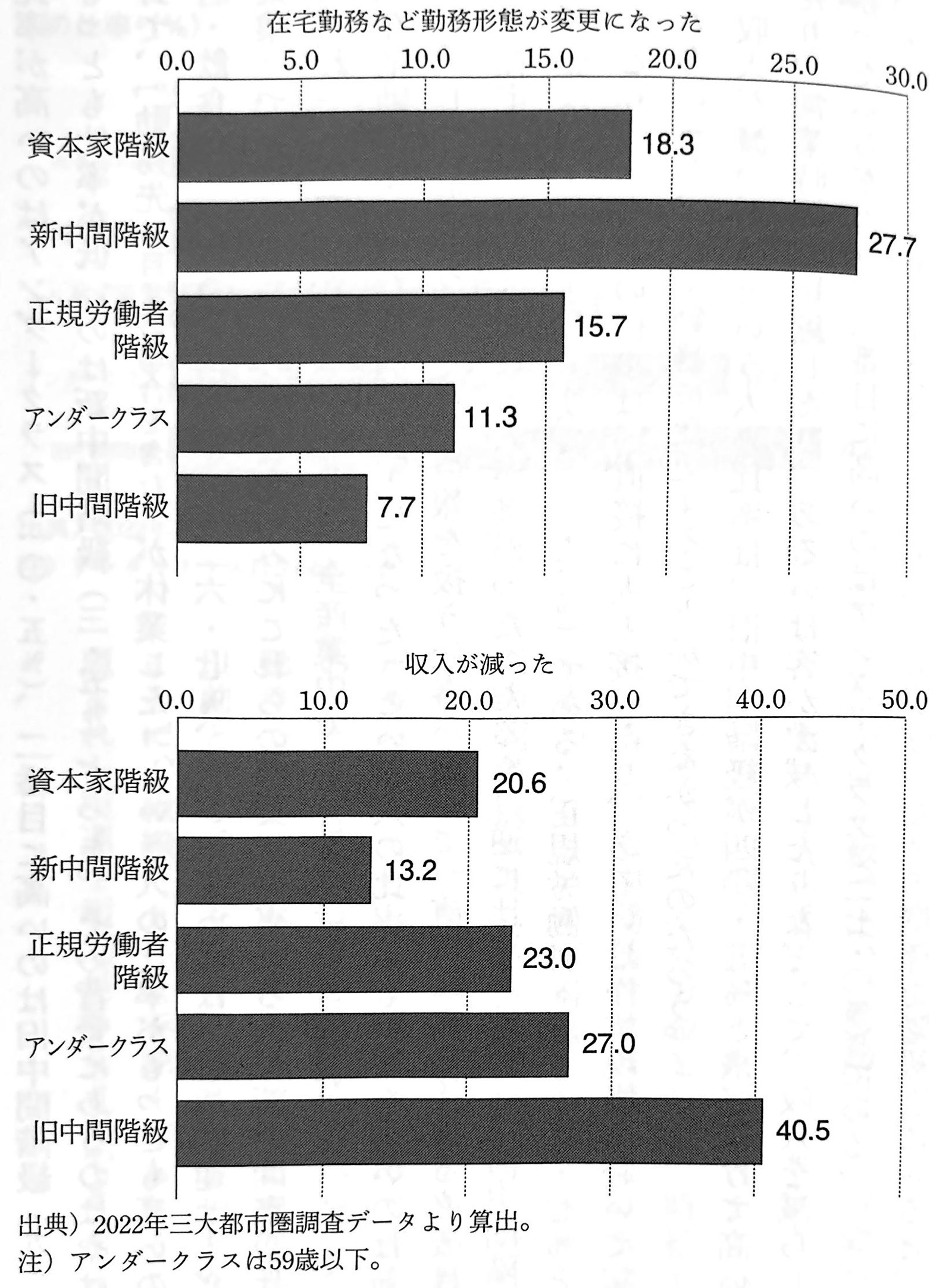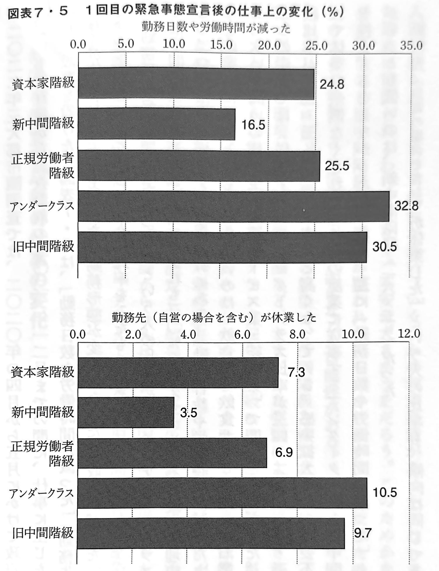 「収入が減った」という人の比率は、旧中間階級が40.5%と飛び抜けて高い。休業したり、営業時間を短縮したり、あるいは客が激減したりなどして、収入を減らした人が多かったからだろう。二番目に高いのはアンダークラス(27.0%)である。