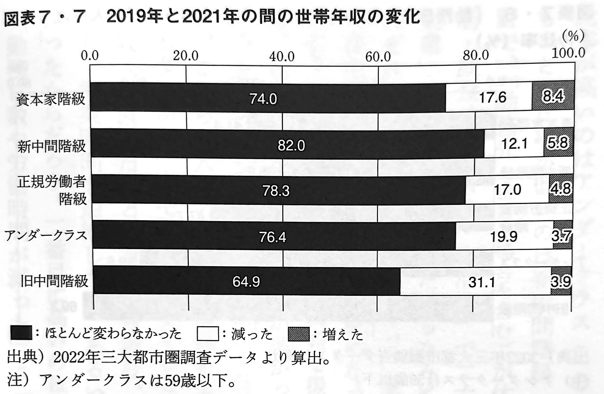「勤務人数や労働時間が減った」と「収入が減った」の関係を階級別にみると、興味深い事実が明らかになる(図表7・6)(下図を参照)。アンダークラスと旧中間階級では、「勤務日数や労働時間が減った」という人のうち、それぞれ59.6%、69.3%が「収入が減った」と答えている。アンダークラスの多くは賃金を日給や時給で受け取っているし、旧中間階級は営業している間しか収入が入ってこないのだから、当然だろう。ところが新中間階級では、この比率が35.9%と低い。勤務人数や勤務時間が減ったにもかかわらず収入が減らなかったという人が3分の2近くにも上るのである。新型コロナ禍で仕事が減ったり、在宅勤務で勤務時間が減ったりしたにもかかわらず、以前と同じ賃金を受け取ることができたというところに、組織によって手厚く守られるこの階級の恵まれた境遇を垣間見ることができる。2022年三大都市圏調査では、調査前年にあたる2021年の世帯年収を尋ねたあとで、新型コロナ感染症が流行する前の2019年に比べたときの2020年と2021年の世帯年収の変化を、「ほとんど変わらなかった」「減った」「増えた」の三つの選択肢で尋ね、「減った」と「増えた」の場合には何パーセントくらい変化したかを尋ねた。これらの回答を統合すれば、2019年と2020年の世帯年収を、概算ながら知ることができる。集計した結果、2019年と2020年の間の変化は非常に大きいが、2020年から2021年の変化は小さいことがわかった。このため以下では、2019年と2021年の間の変化を中心にみていくことにしたい。