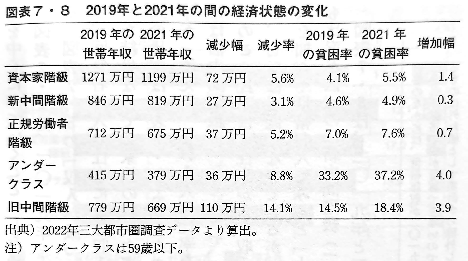 貧困率とその変化をみると、やはり旧中間階級とアンダークラスの受けた衝撃が大きかったことがわかる。資本家階級、新中間階級、正規労働者階級は、もともと貧困率が4-7%程度と低く、いずれも貧困率が上昇してはいるものの、0.3-1.4%とわずかな変化にとどまっている。これに対して旧中間階級は、もともと貧困率が14.5%と高いのだが、これが3.9%上昇して18.4%となった。ほぼ5人に1人が貧困層である。またアンダークラスは、もともと貧困率が33.2%と非常に高いのだが、これが4.0%も上昇して32.7%となった。この二つの階級では、貧困線をぎりぎりで上回っていた多くの人々が、新型コロナ禍によって貧困層に転落したようである。『新しい階級社会』 第七章 より 橋本健二:著 講談社:刊