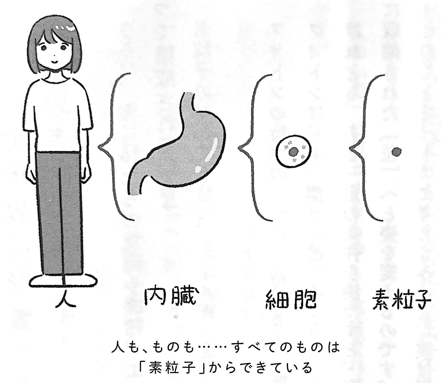 この細胞を分解していくと、やがて最小単位である「素粒子(そりゅうし)」と呼ばれるものに行きつきます。