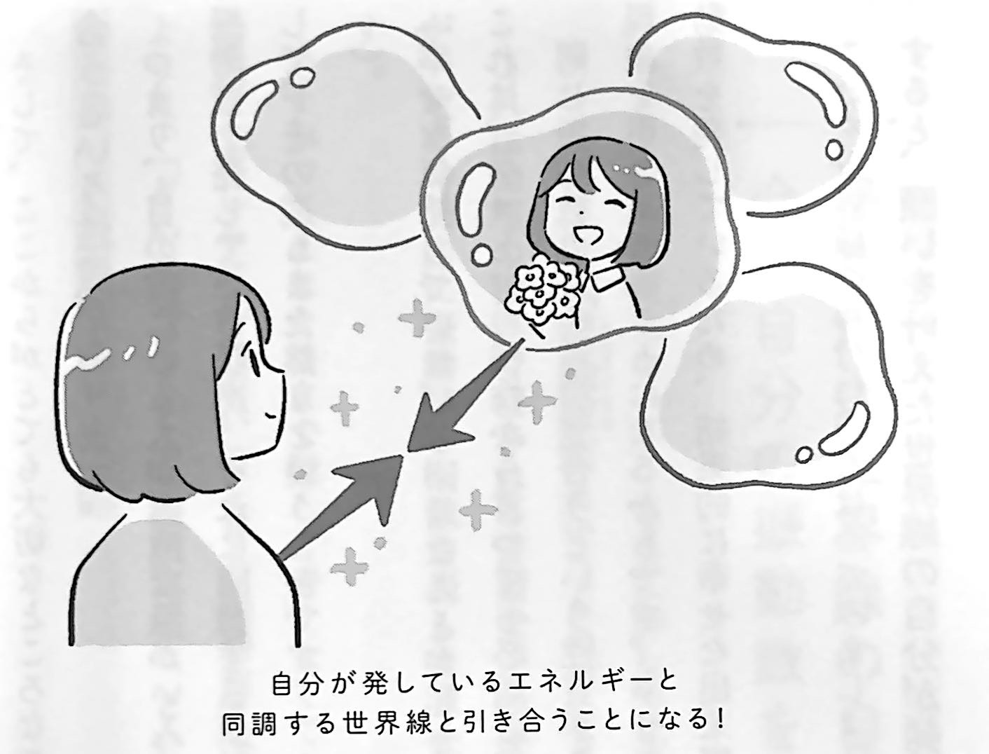 すると、願いを叶えた世界線の自分が発しているであろうエネルギーと、今の自分が発するエネルギーを同調させられれば、両者が引き合うということになります(フォトンには、時間も空間も飛び越えるという性質があります)。つまり、仕事で成功したいと思うなら、仕事で成功した世界線の自分が放っているであろうエネルギーを今、放出する。心地よい人間関係を望むなら、それを叶えた自分が発しているであろうエネルギーを今、発する。