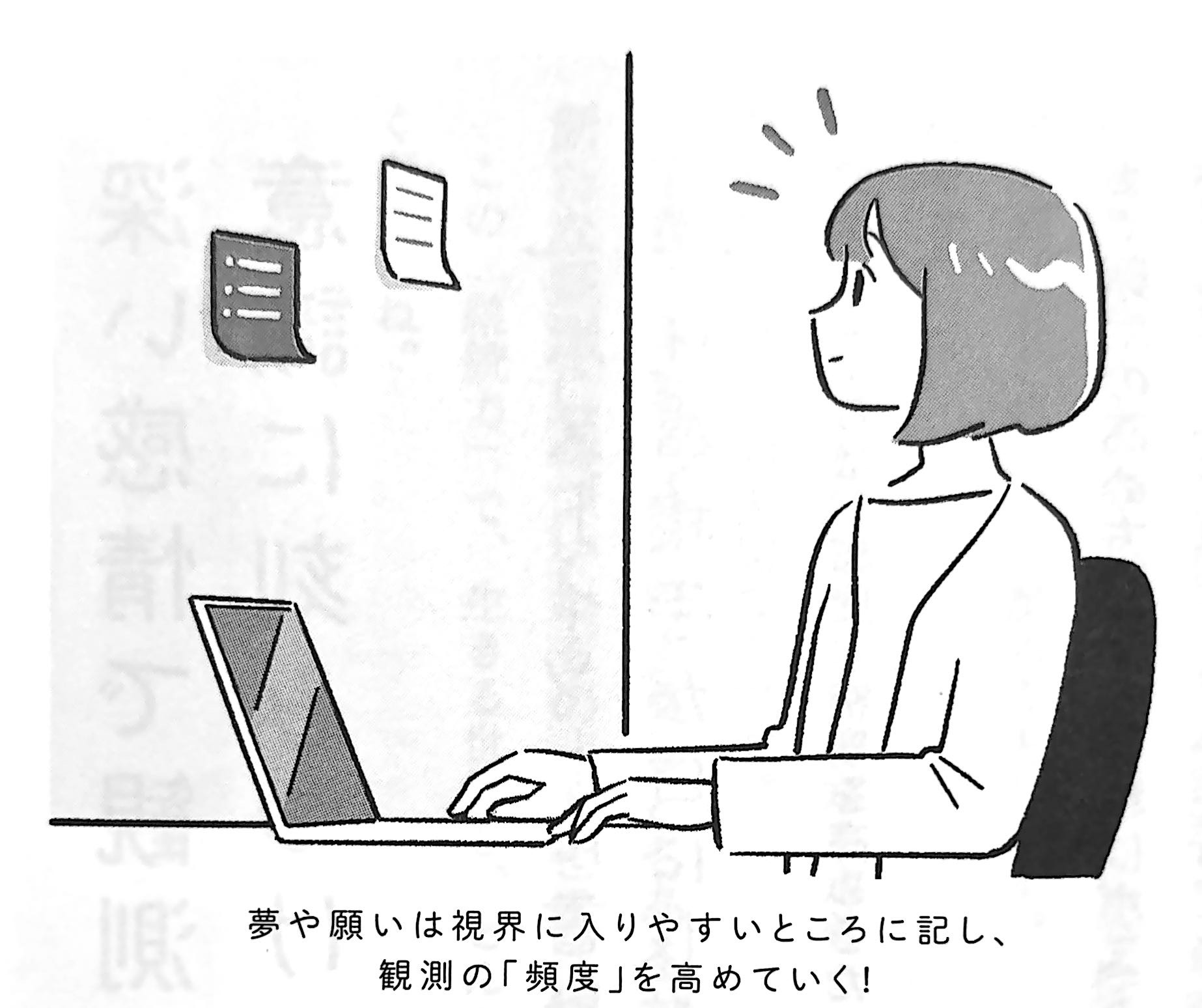 ですから、特にアクションを起こさなくても、自然と目に入ってくる場所に記しておくのがよいと思います。ちなみに私はこのポストイットに、自分の仕事を通して実現したいことを書き、意識に刻み付けていました。するとある日、そんなことはもちろん知らない仕事相手の方が、「ゆささん仕事を通じて、こういうことを実現していただけたら・・・・・・」と、私が書いていたのとまったく同じ内容を話してくれたのです!