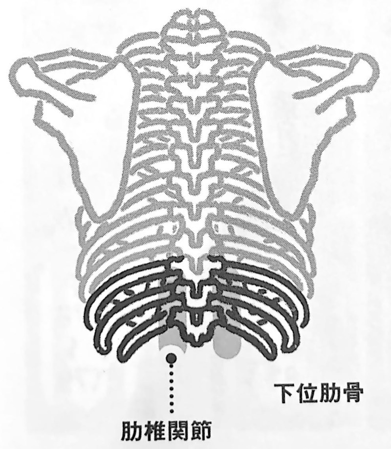 腰痛の原因になっているのが胸椎と肋骨の間にある肋椎関節(下図参照)。特に腰痛は、下側の6対の関節のセンサーが乱れやすいのでそこの動きを絆創膏で活性化します。絆創膏の貼り方