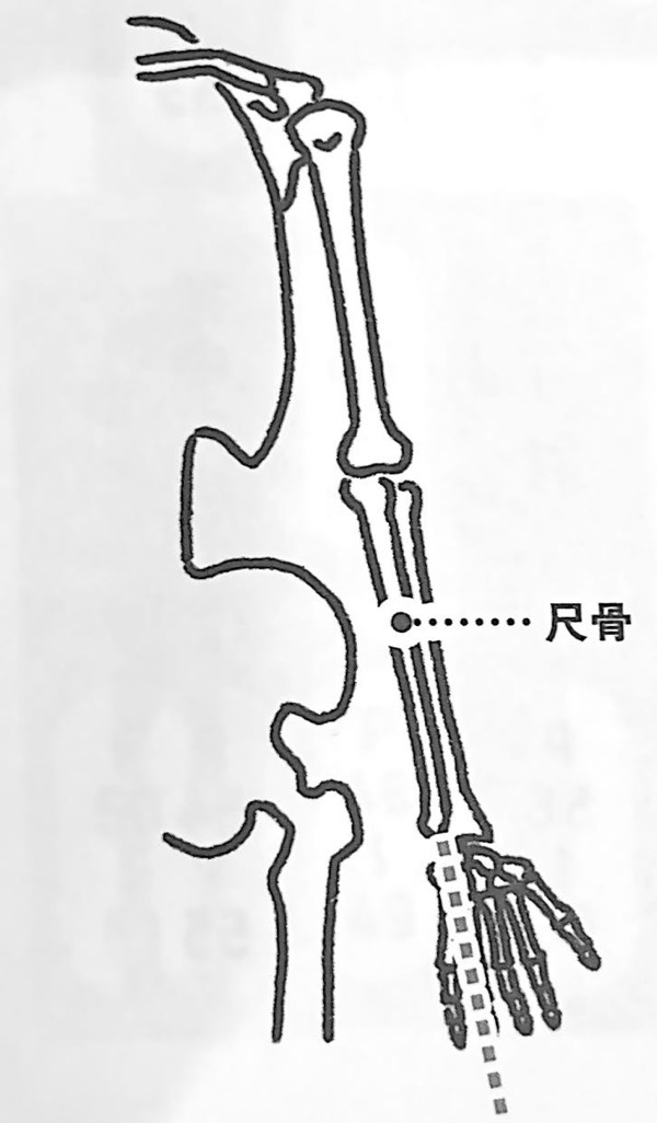 前腕をひねる起点の軸は尺骨(しゃっこつ、下図参照)の延長線上の薬指にあります。そのセンサーを再起動すると、前腕から上腕の過度な内ひねり状態が防げるようになるため、首こりが解消されます。