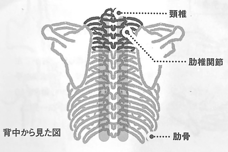 首を上に向けたり、回旋すると、頚椎(けいつい)に対して肋骨が下がります。その動きを絆創膏を貼ることで再現させることにより、上部の肋椎(ろくつい)関節(下図参照)のセンサーが働いて首を正常に動かせるようになります。