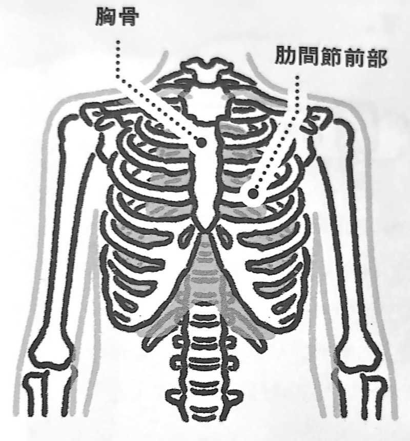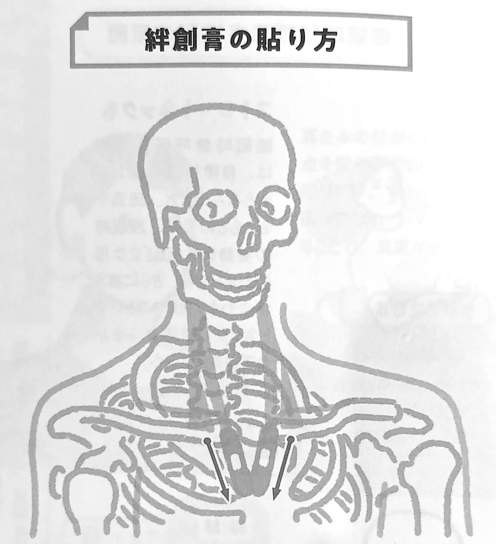 絆創膏の貼り方鎖骨の真下、中央の胸骨の両サイドの第2肋骨を起点に下向きに絆創膏を貼ります(下の図11を参照)。これにより肋間筋のセンサーを刺激し安静時の呼吸がしやすくなり自律神経が安定。視力もよくなります。かぶれやすいので貼る時間は1分で。
