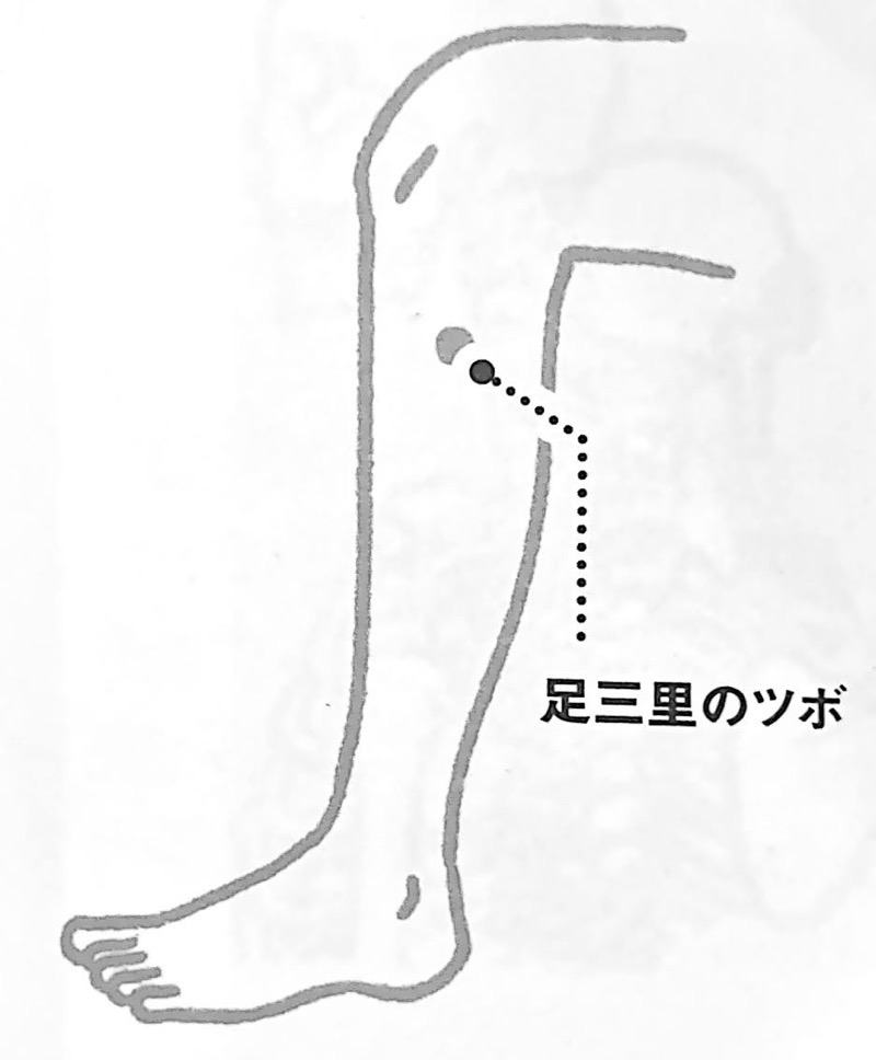 ひざの外側にある便秘のツボとしても知られる足三里(あしさんり)には、ちょうどツボの位置に前傾をするために重要な筋肉、前脛骨筋(ぜんけいこつきん)があります。ツボと筋肉の両方を絆創膏で刺激します(下図を参照)。