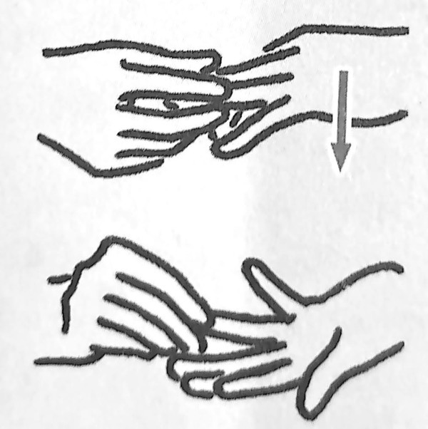 左手の手の平を下にして、右手で左薬指を軽くつまみます。そのまま左手の平を上に回転させるという動きを10回行うことで薬指へのアプローチに。右手も同様に行いましょう。