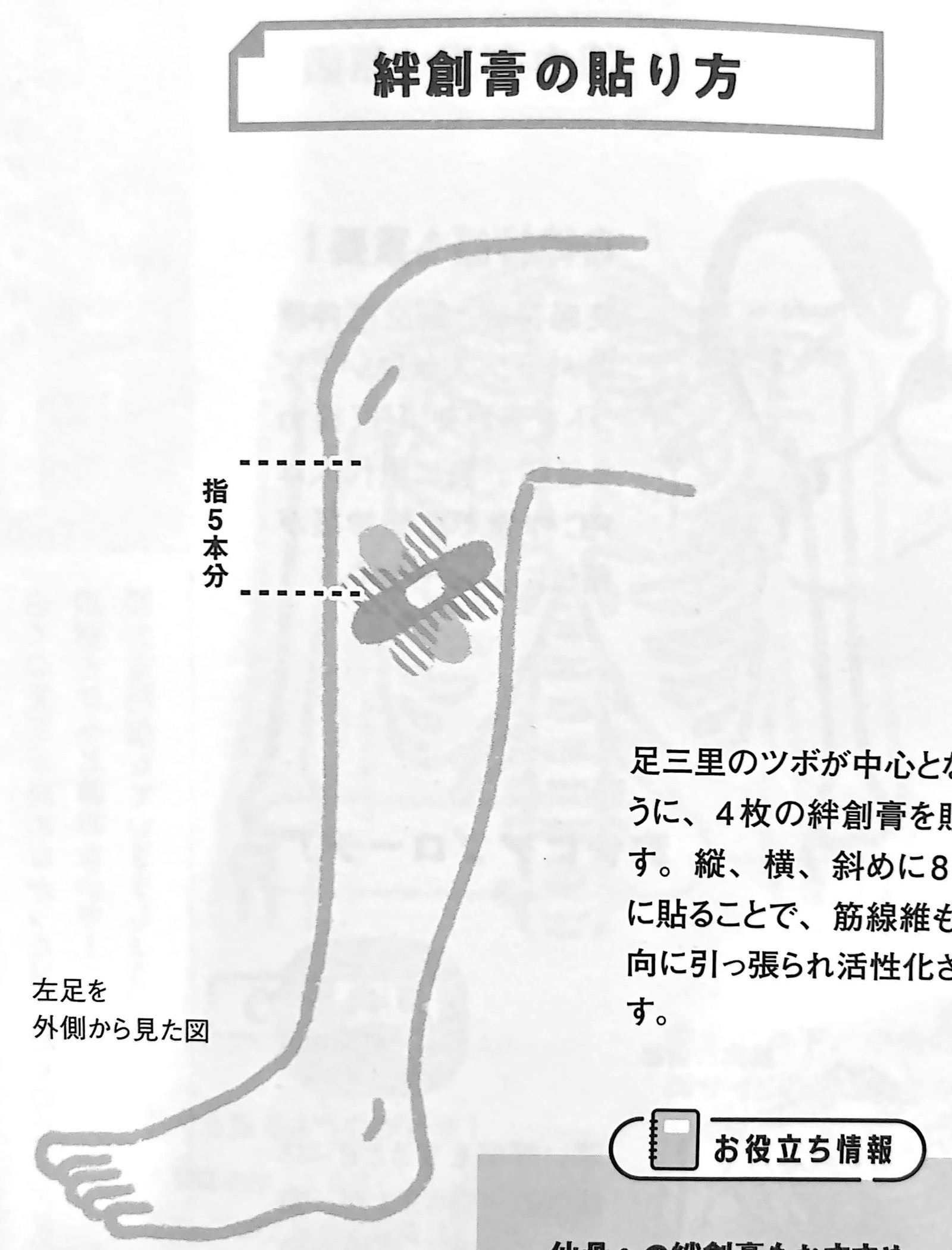 絆創膏の貼り方足三里のツボが中心となるように、4枚の絆創膏を貼ります。縦、横、斜めに8方向に貼ることで、筋繊維も8方向に引っ張られ活性化されます(下の図10を参照)。