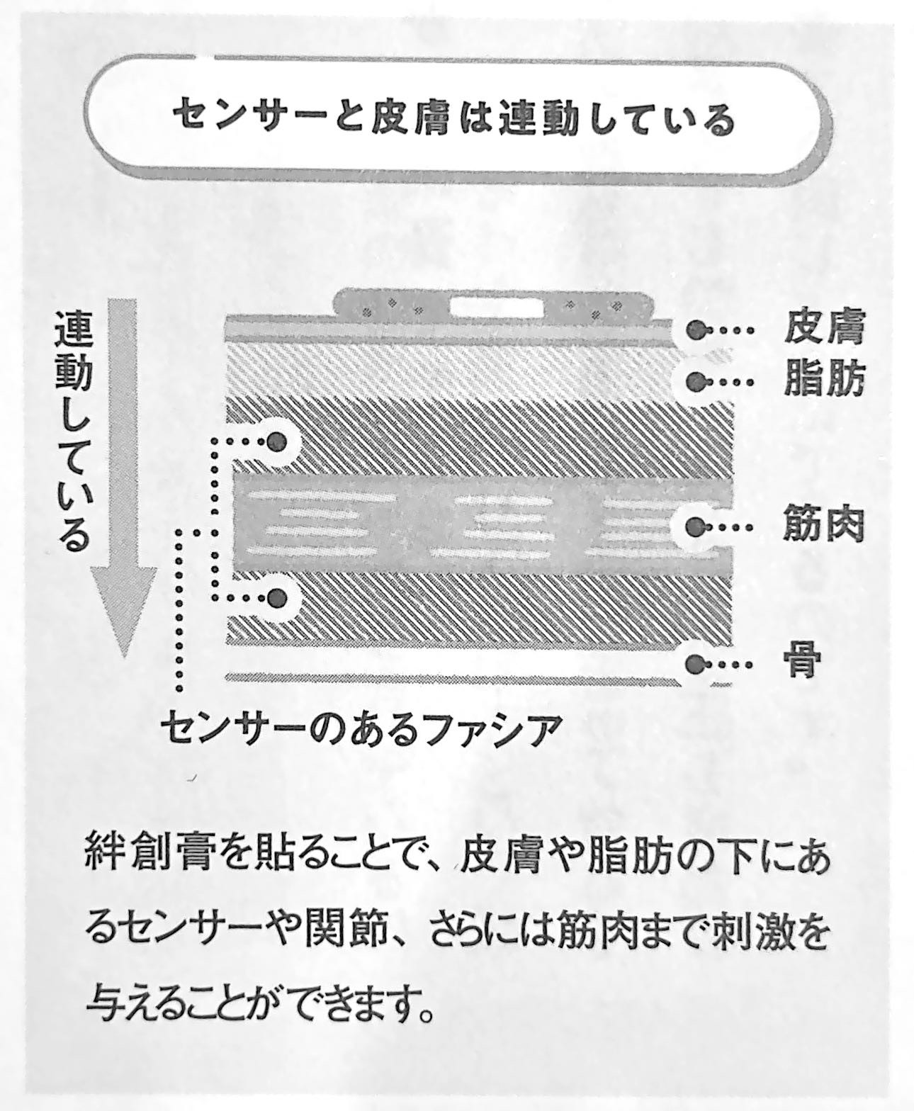 関節のセンサーはわずかな伸長にも反応するセンサーなので、絆創膏程度の優しく皮膚を伸長する刺激で、山内流メソッドと同等の効果を出せるのです。肋骨以外でも、各関節の動きの特性に合わせて絆創膏を貼ることで、関節のセンサーを目覚めさせ関節を正しく動かしていくことができます。また、こりや痛みは関節のセンサーが正常でも筋肉自体に働き不足やこり固まりがあると引き起こされてしまいます。ここで絆創膏の登場です。