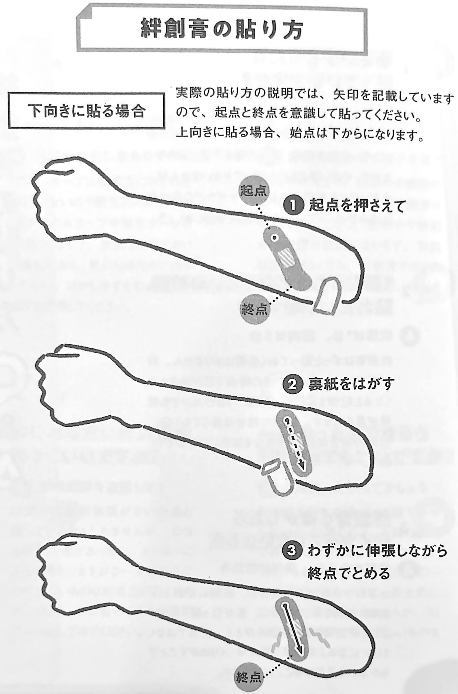 上向きに貼る場合、始点は下からになります(下の図3を参照)。『絆創膏を貼るだけ整体』 第1章 より 山内義弘:著 KADOKAWA:刊