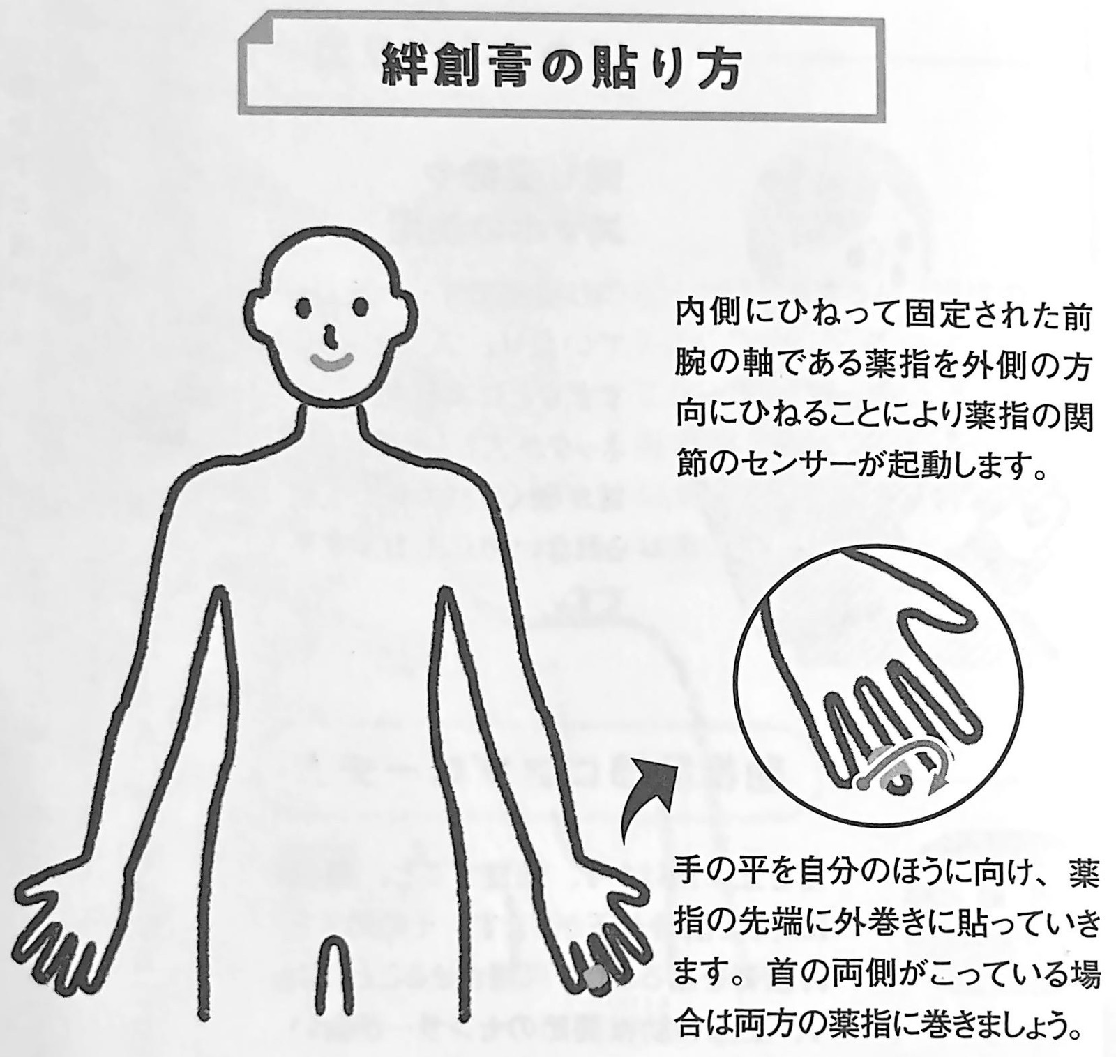 絆創膏の貼り方内側にひねって固定された前腕の軸である薬指を外側の方向にひねることにより薬指の関節のセンサーが起動します。
