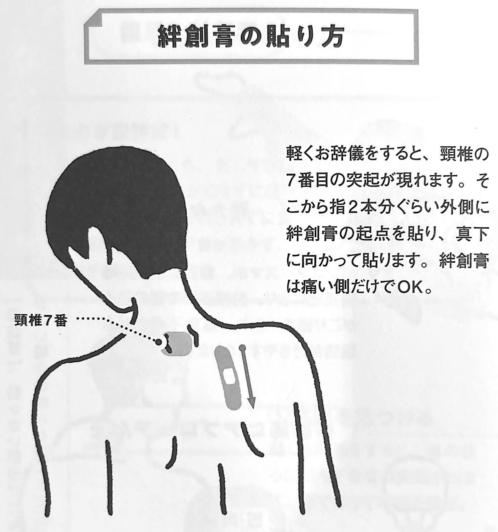絆創膏の貼り方軽くお辞儀をすると、頸椎の7番目の突起が現れます。そこから指2本分ぐらい外側に絆創膏の起点を貼り、真下に向かって貼ります。絆創膏は痛い側だけでOK(下の図5を参照)。