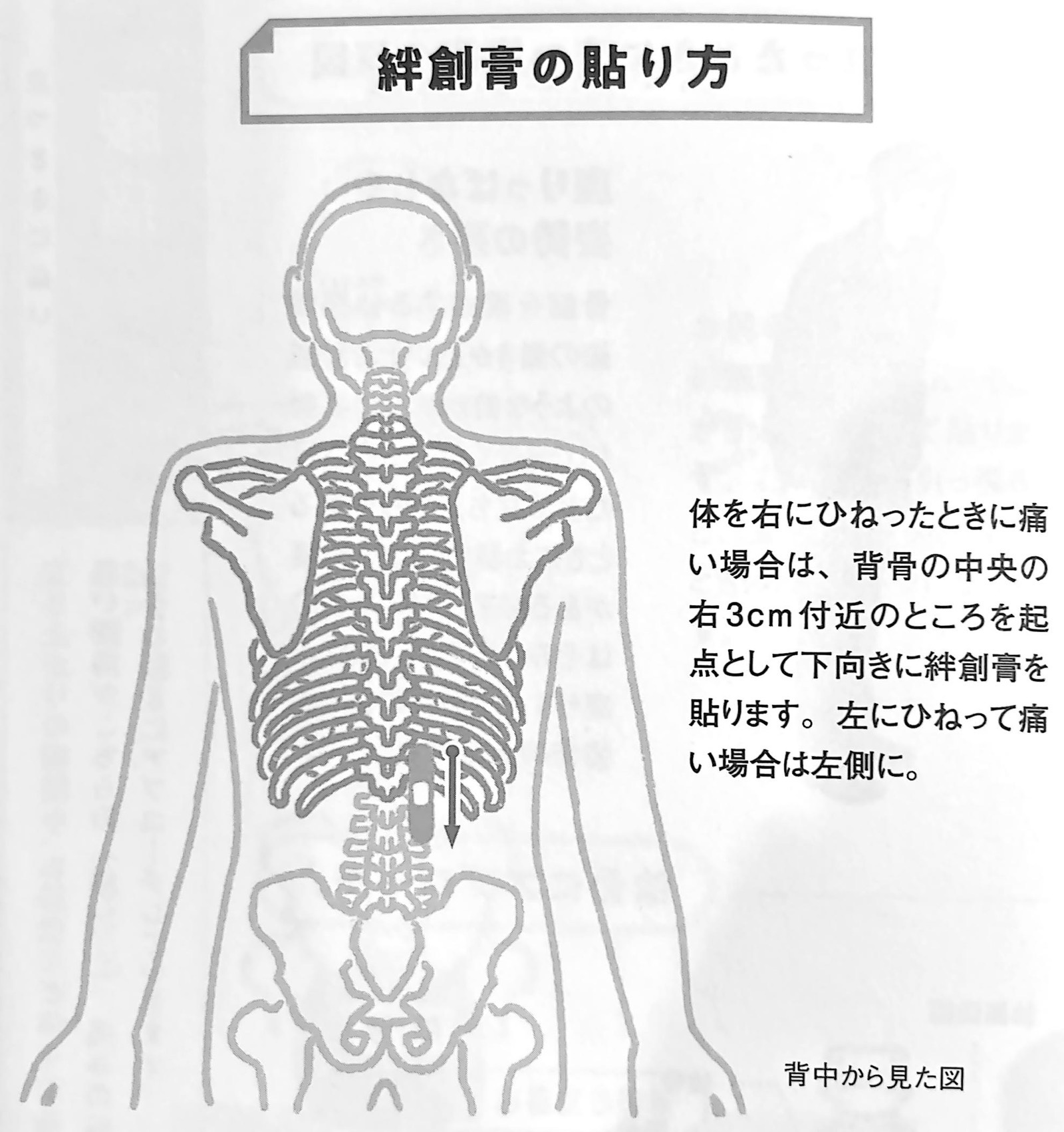 体を右にひねったときに痛い場合は、背骨の中央の右3cm付近のところを起点として下向きに絆創膏を貼ります。左にひねって痛い場合は左側に(下の図6を参照)。