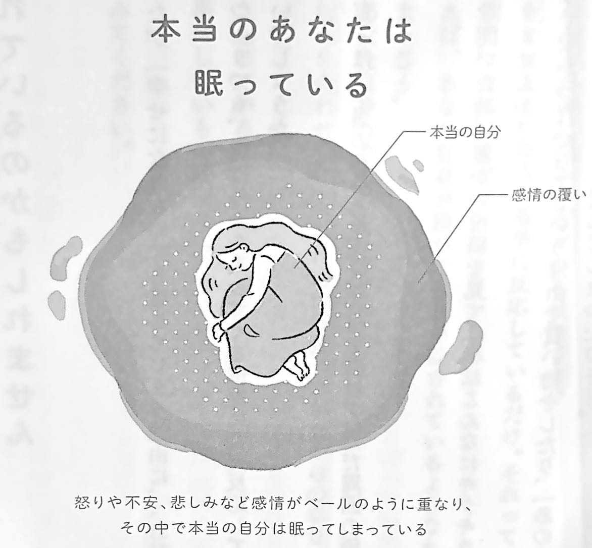 眠っているとは、教えこまれた価値観や過去の経験に振り回されることで、自分の本当の気持ちやどうしたいか、という思いを見失ってしまっている状態のことです。「こうあるべき」「こうすべき」という既存の価値観に振り回されることによって、怒りや不安、楽しみといった感情が触発されます。これらの感情は、解放されなければ心にのしかかり、まるで幾重にも重なるベールのように本来のあなたを覆い隠してしまいます。この「感情の覆い」によって、あなたは本当の自分を見失い、幸せから遠ざかってしまうのです(下の図1を参照)。