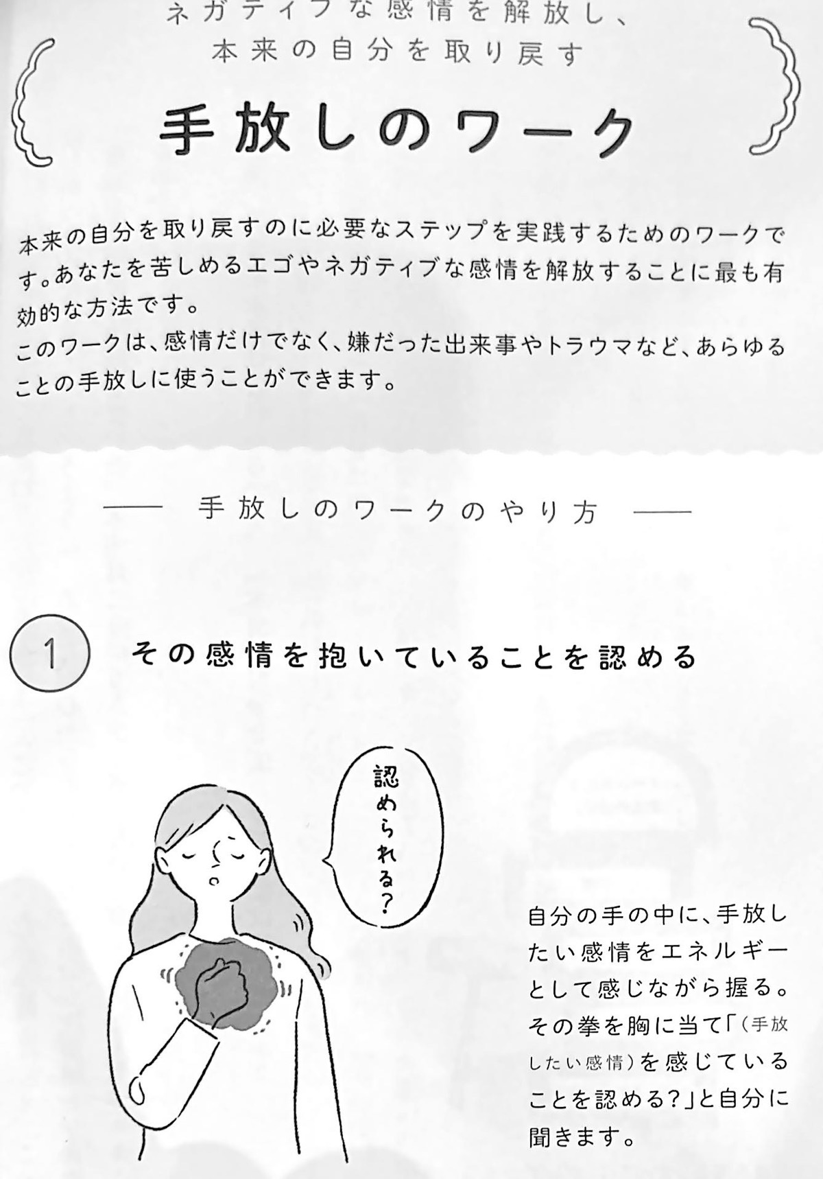 これは、今感じているものでも、ちょっと前に体験したネガティブな出来事まで、いまだに気持ちが乱れていたり、思い出すと湧いてくるネガティブな気持ちでも構いませんので、題材をひとつ選んでください。本の冒頭に、図解した「手放しのワーク」もご紹介しています(下の図5を参照)。
