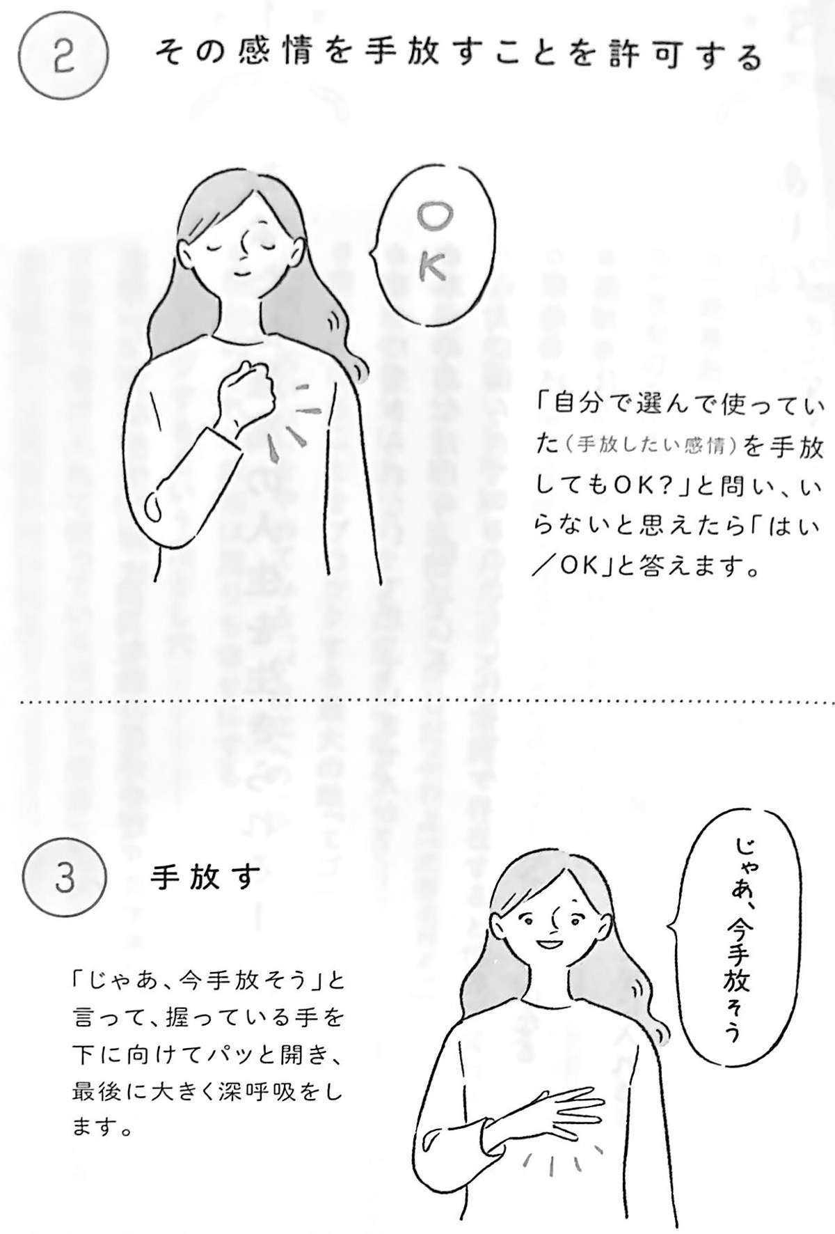 と自問し、「はい」と自答します。その際、両手をギュッと握って、その中に真っ黒い石ころのような不安の塊を持っているのをイメージしてみましょう。②次に、それを手放すことを「許可」するために、「この感情を手放してもOK?」と自分に聞いて、「はい」と答えます。